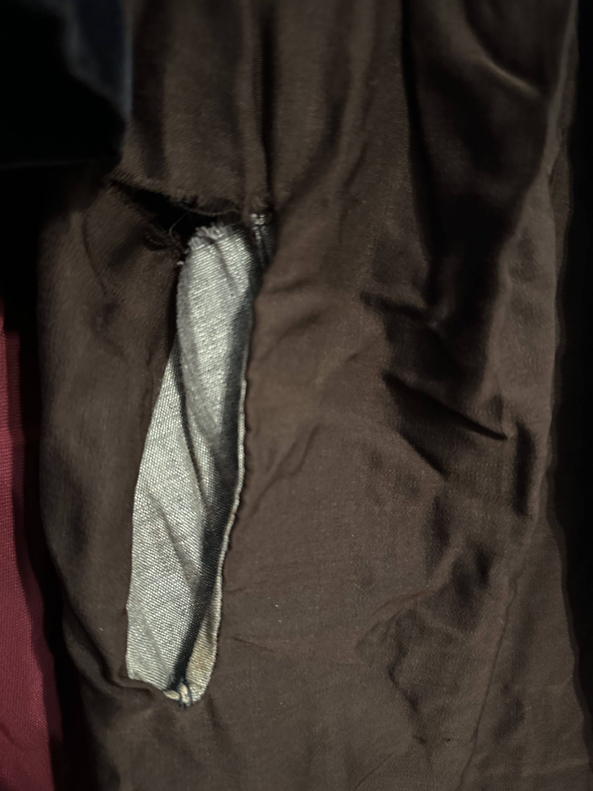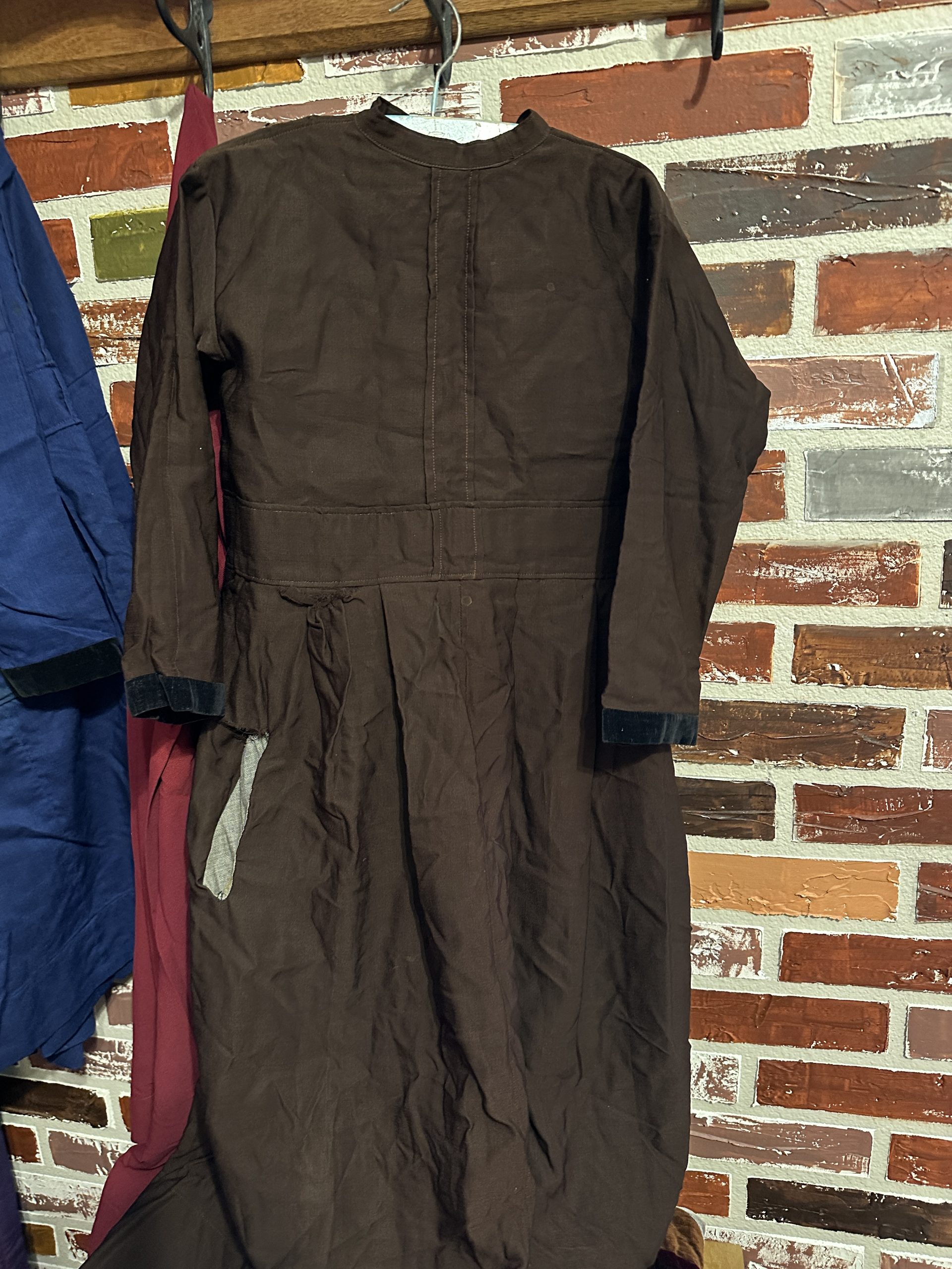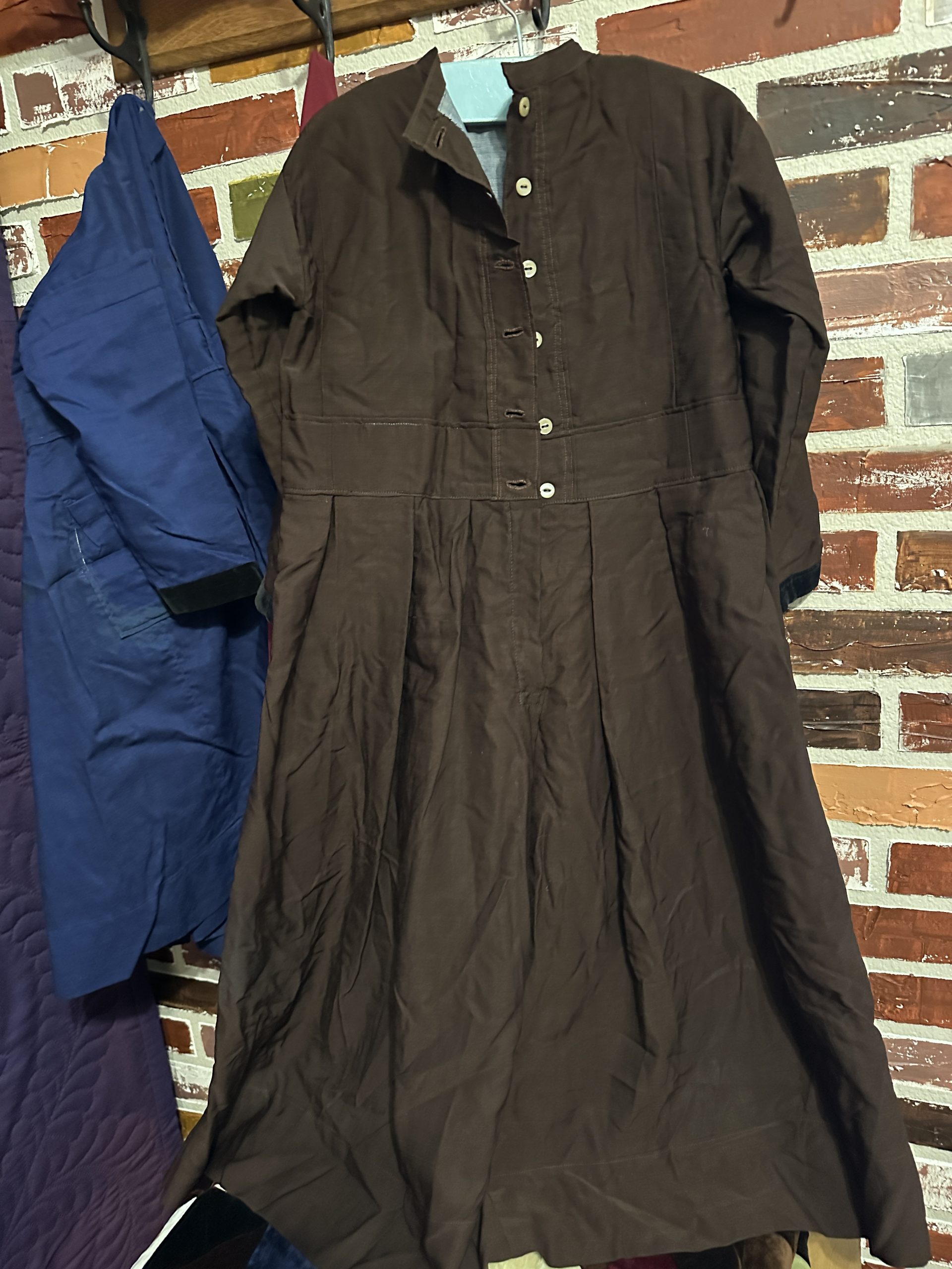 The bodice is lined with blue woven cotton, the sleeves are lined with black polished cotton. Black velvet trims the cuffs. Inside the bodice, there is a 2″ pleat where it was tailored to fit a younger child. This was made in a way that it could easily be let out again when needed.