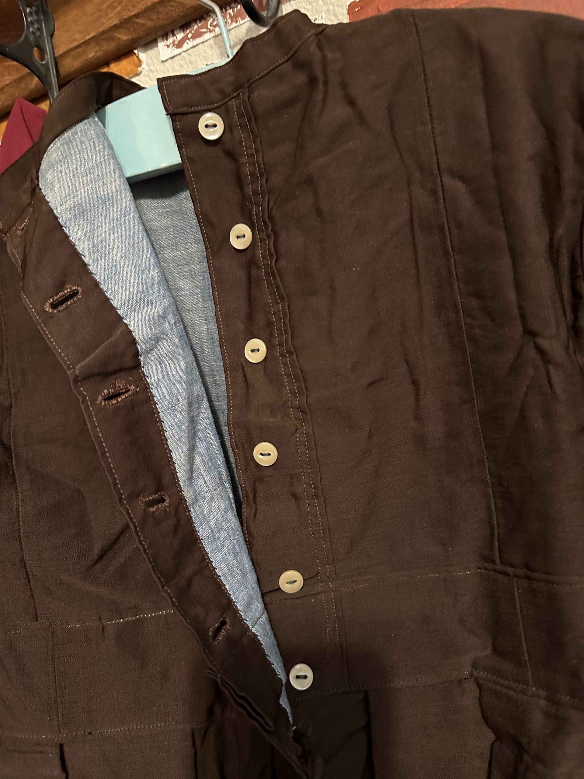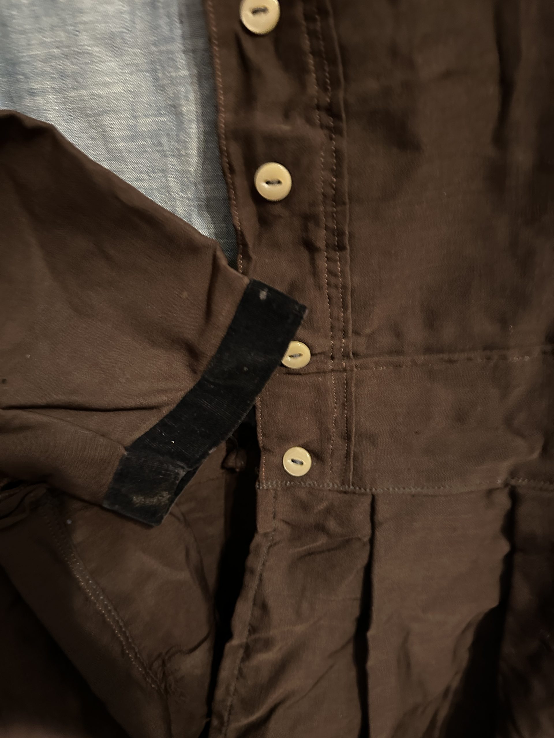 This sweet piece would have been worn with the buttons down the back. There are hand sewn button holes. The buttons have been identified as “Mother of Pearl” and show a pale, creamy -yellow hue and light translucency as well as a soft glow which are hallmarks of genuine shell based mother of pearl. These most likely date 1880s to 1920s.