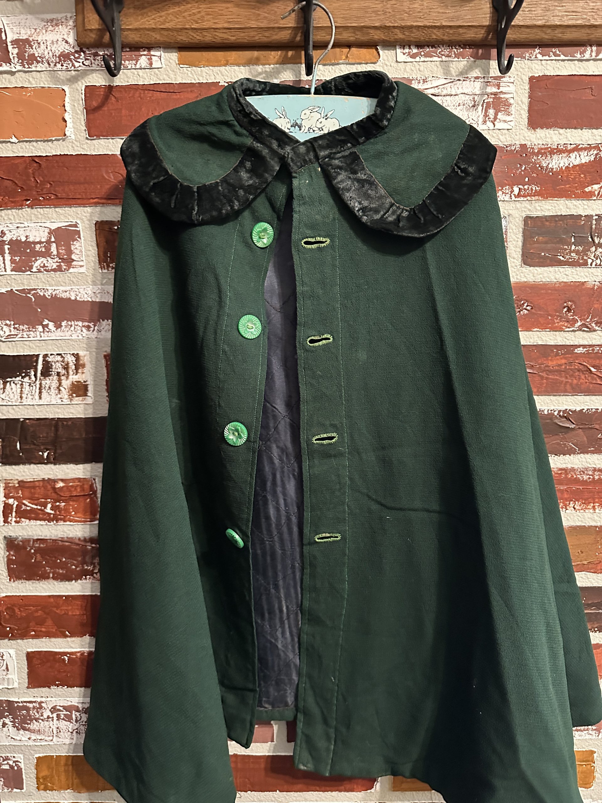This little cloak measures 24″ long and has 48″bottom circumference. The collar measures 6″ deep. Neck, when snapped closed has a 12″ circumference opening