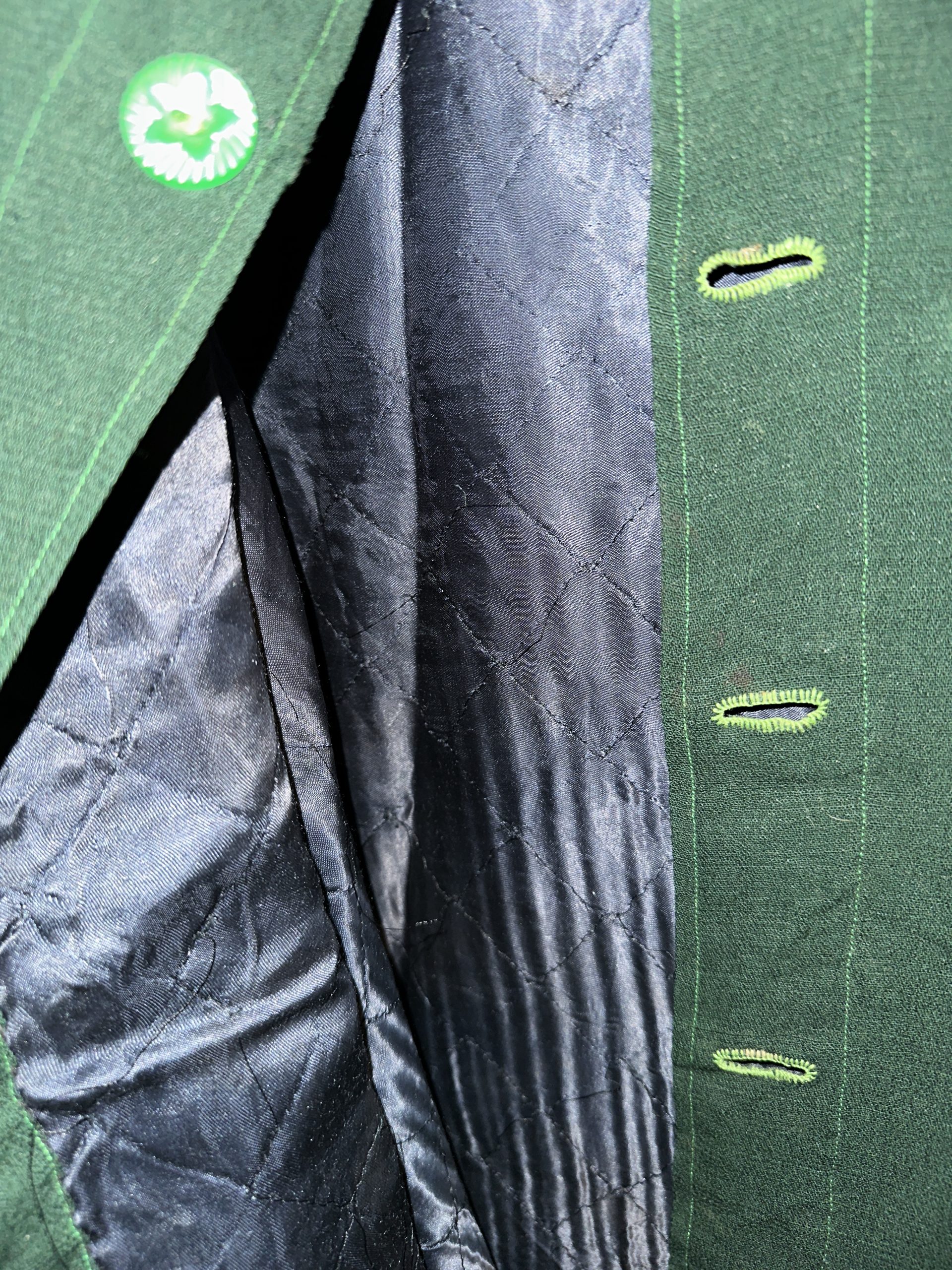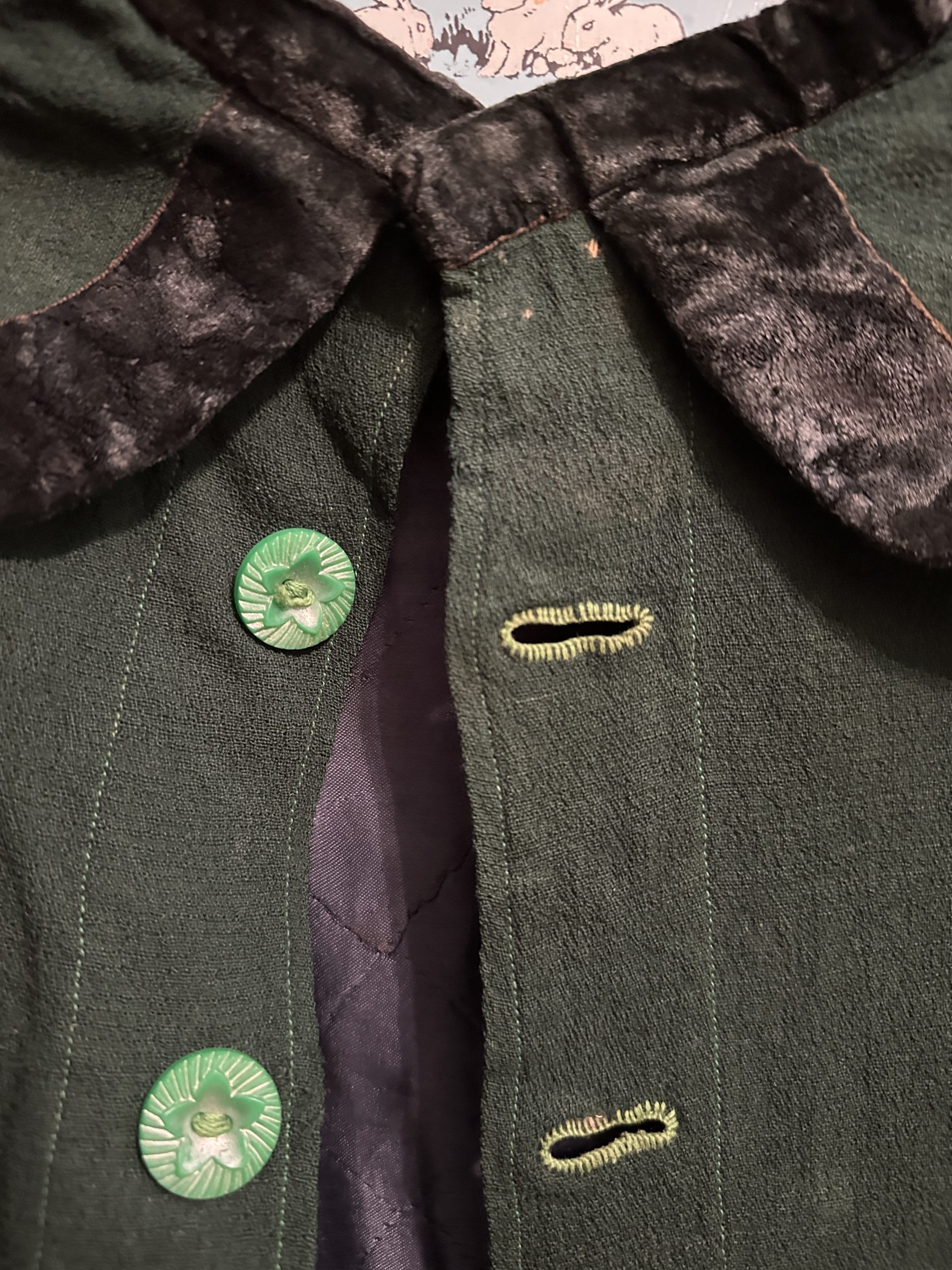 Made of a deep, dark green, wool crepe. Lined with a black satin and trimmed with black velvet