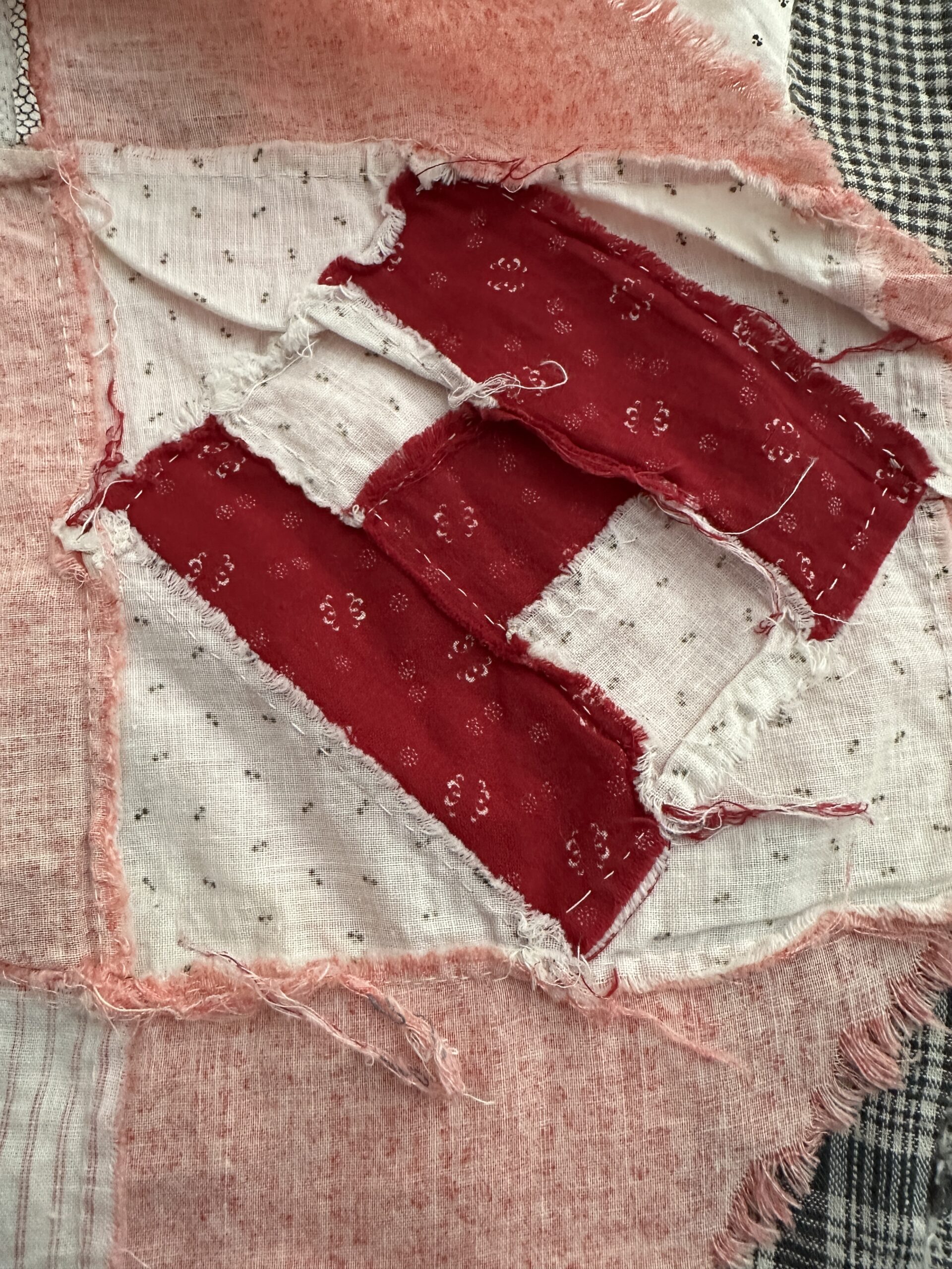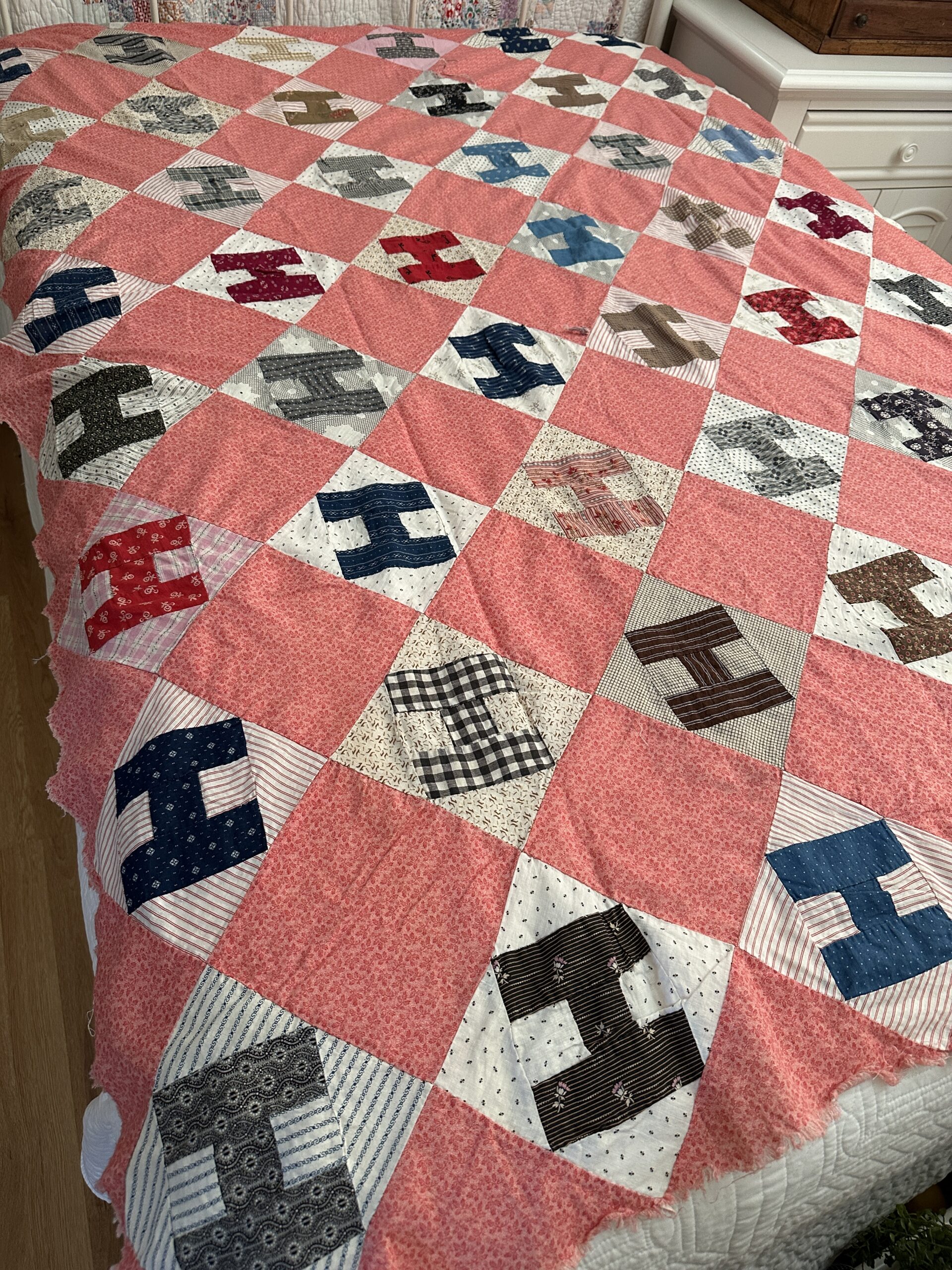 Someone has washed this one, which is nice because there are no stains….but you should not wash antique quilt tops and this one is a good example, as many of the seams have opened!
