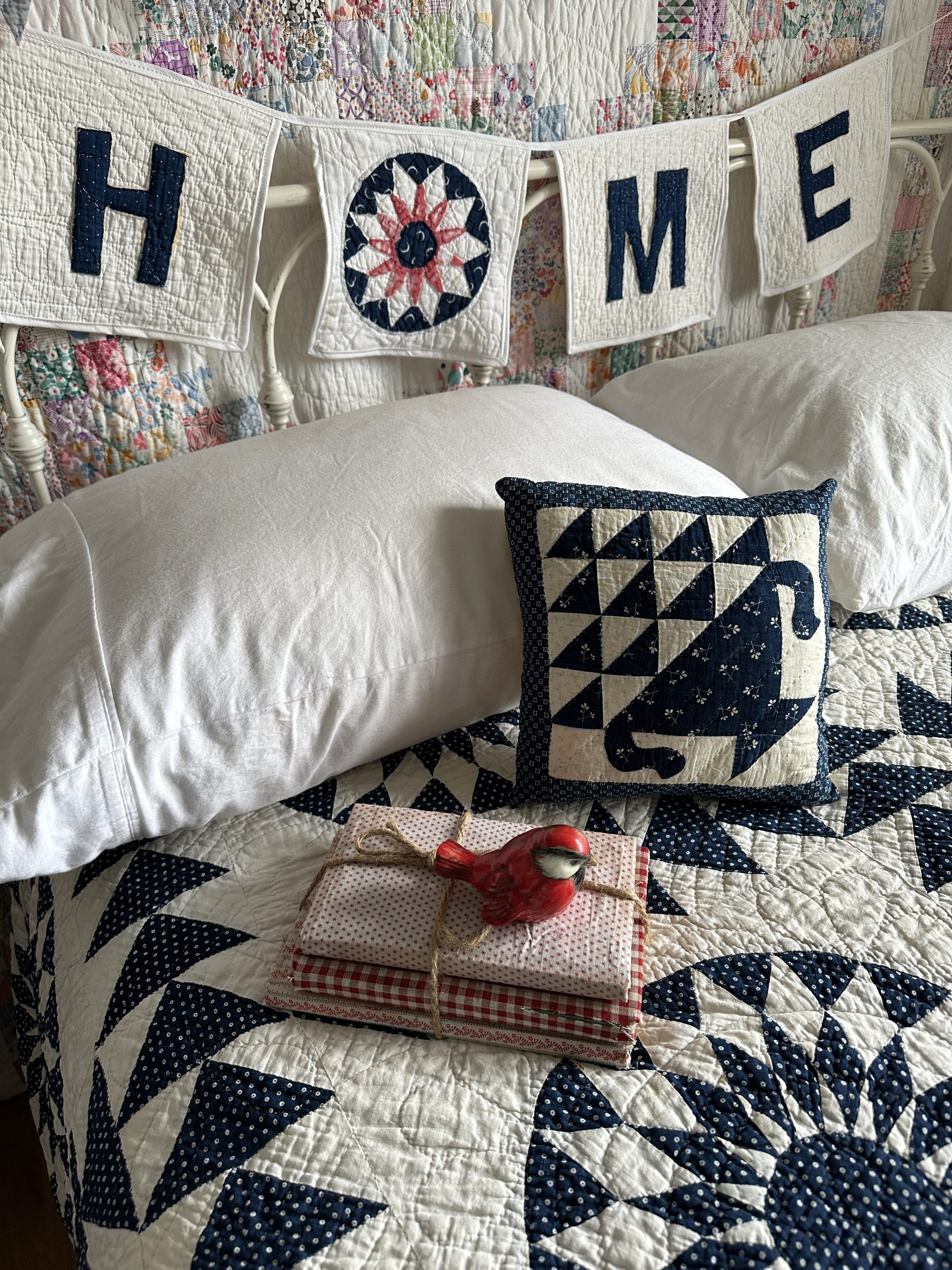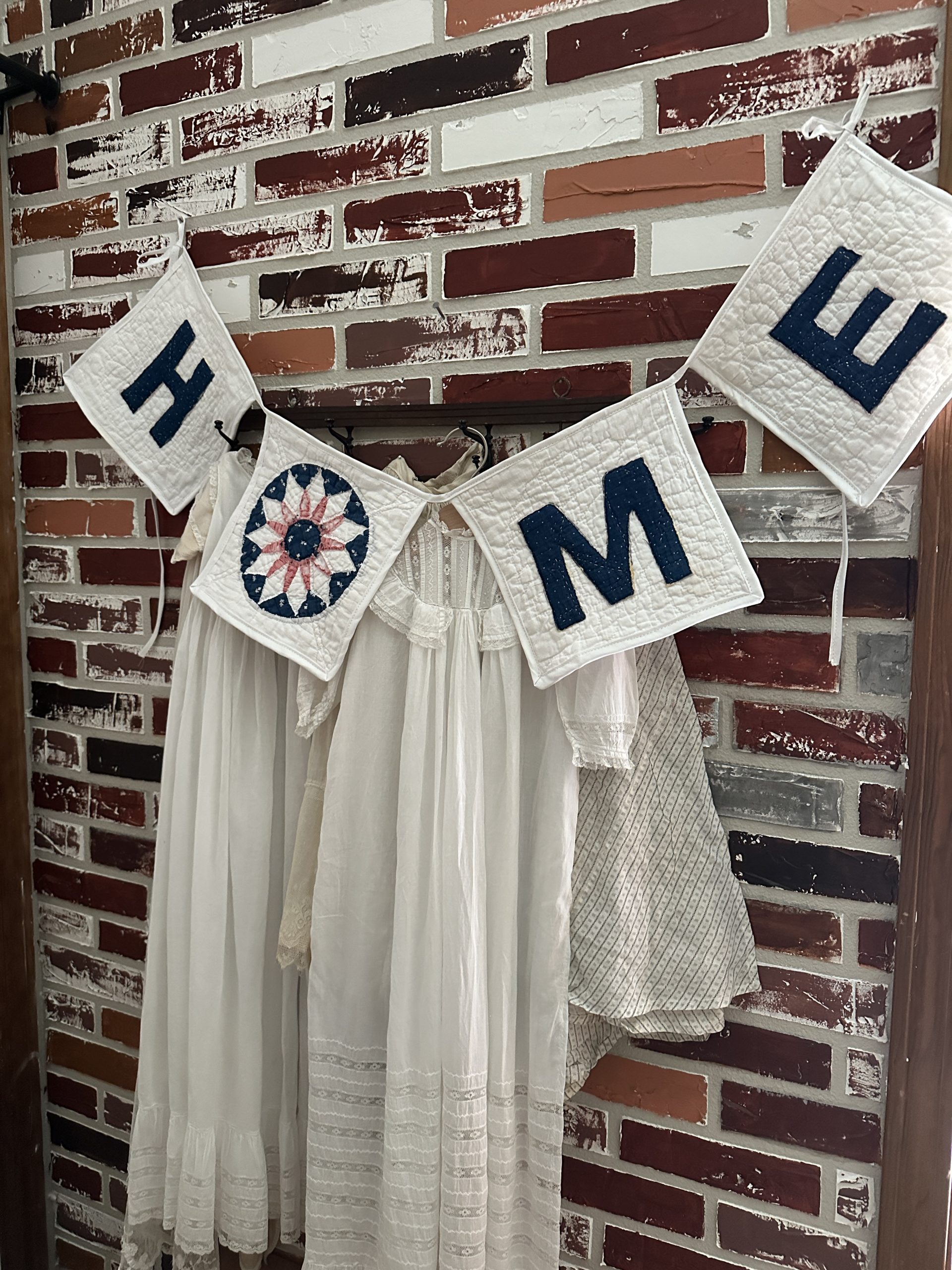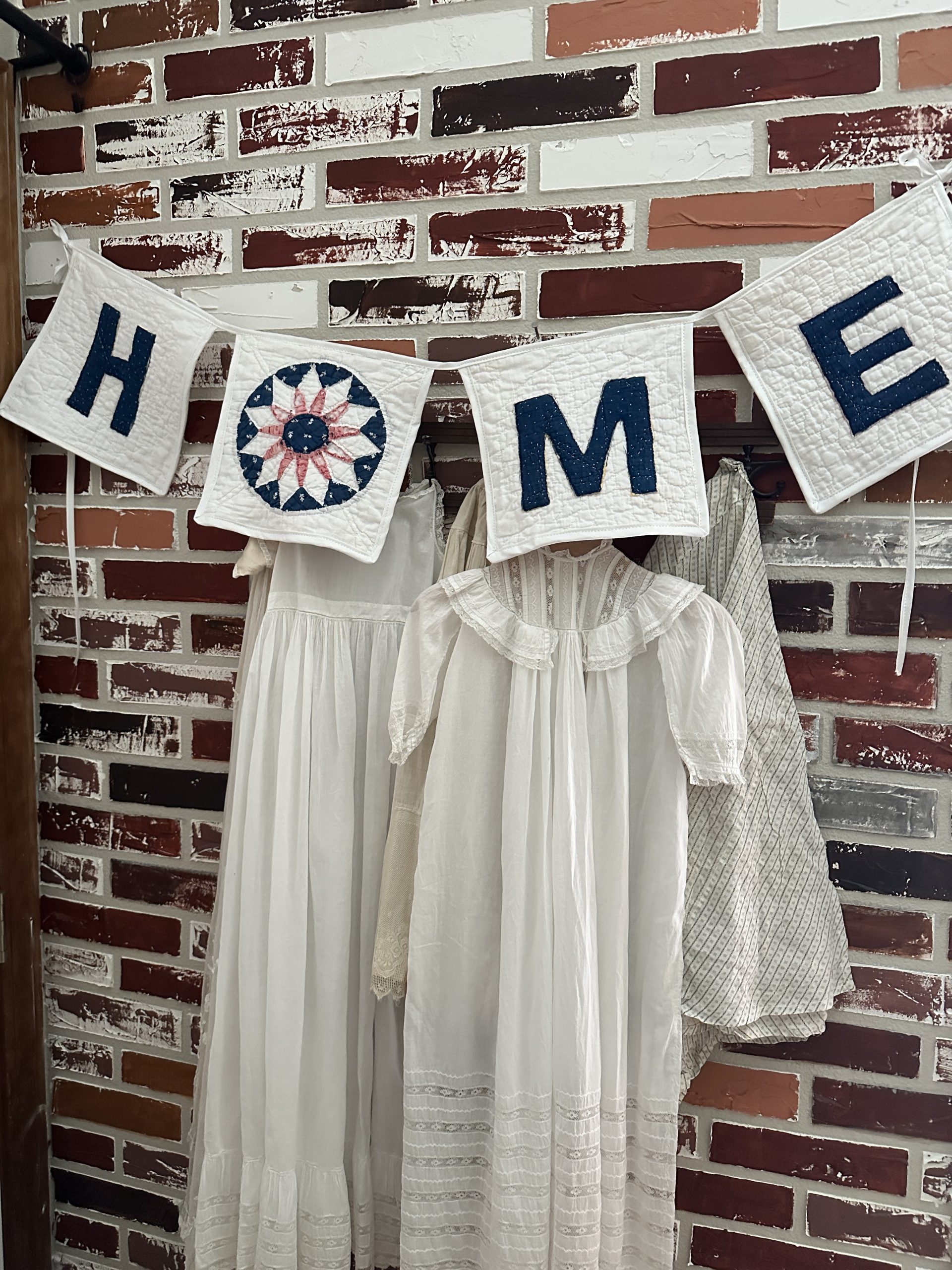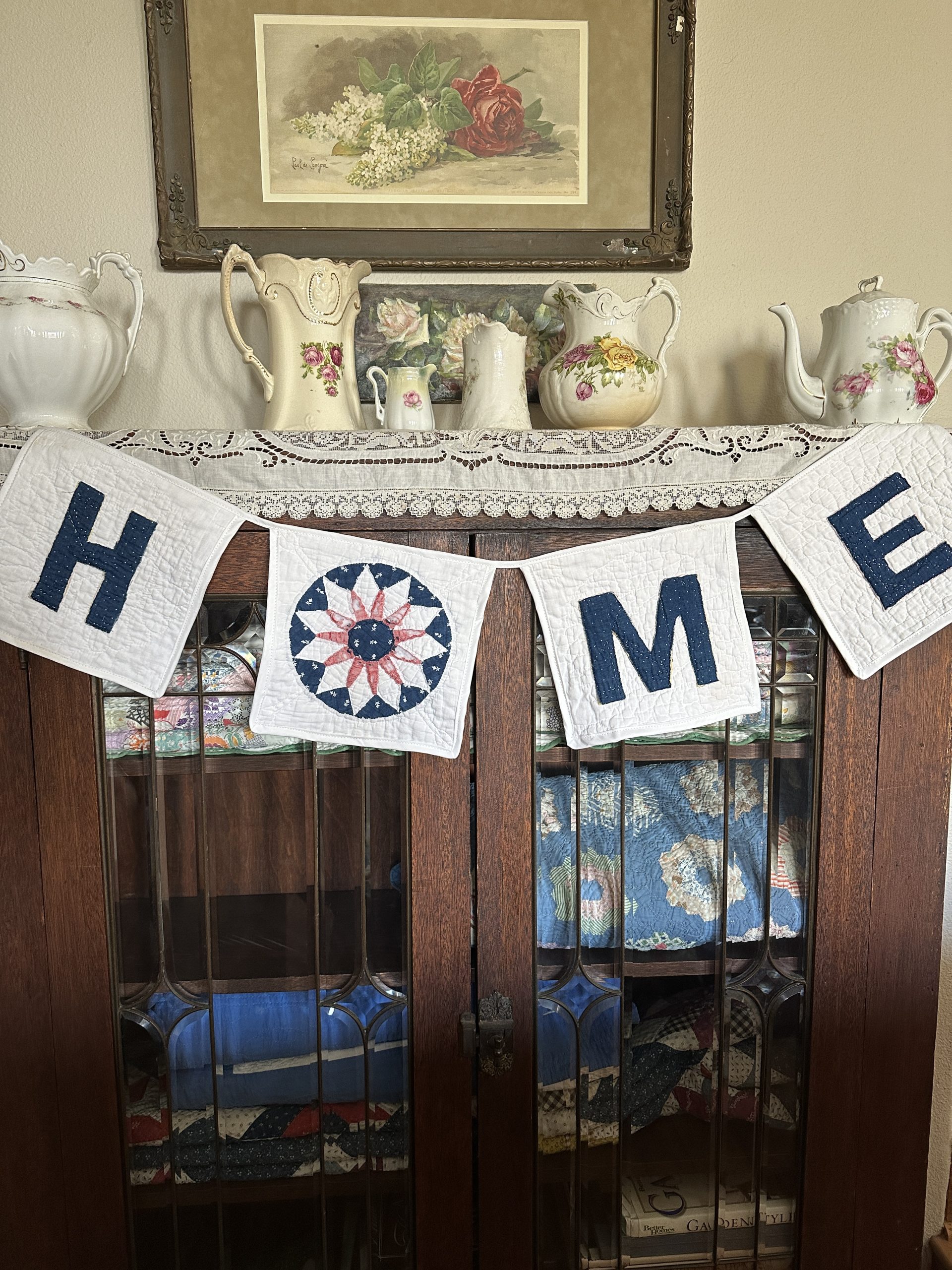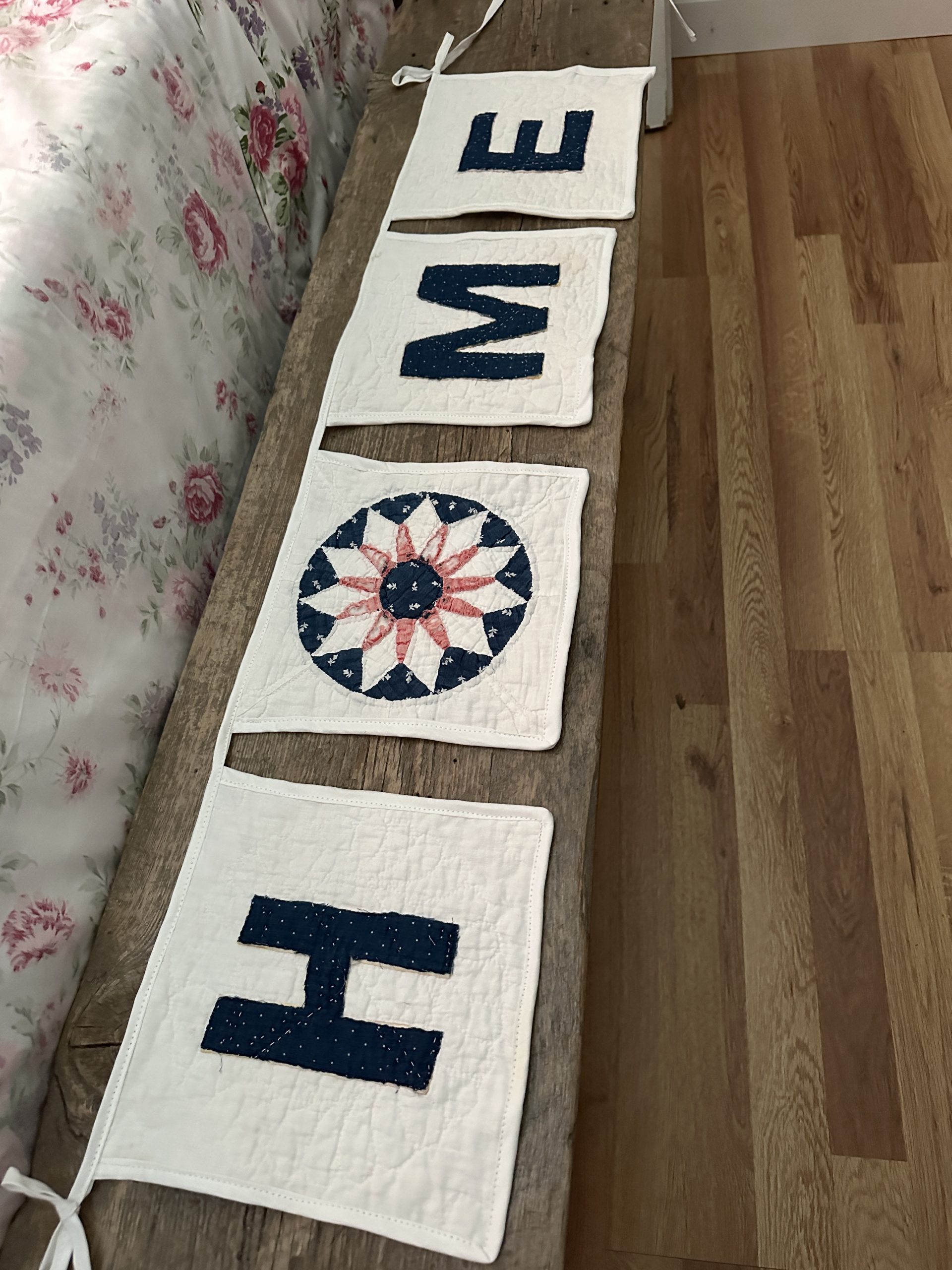 Sweet and sentimental, a wonderful vintage quilt banner that says “HOME”