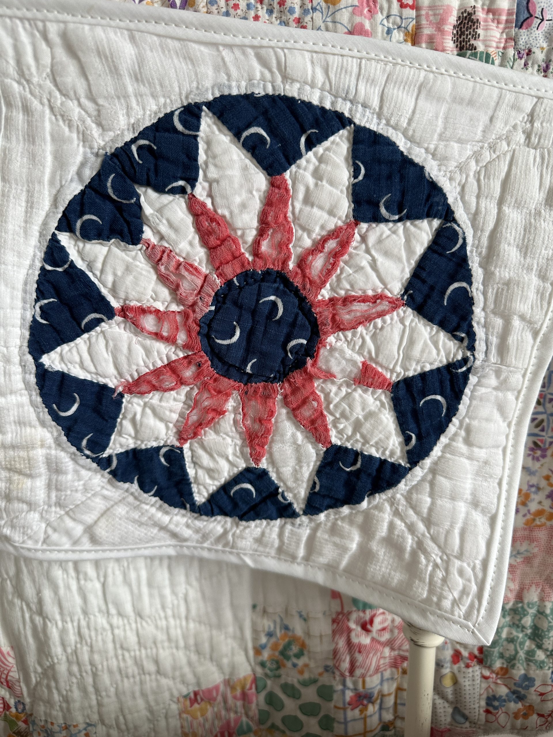The beauty of this design is the “O” which is made from a gorgeous 1860s quilt piece with narrow spikes. This piece does have surface wear, but it doesn’t take away from the amazing handwork.