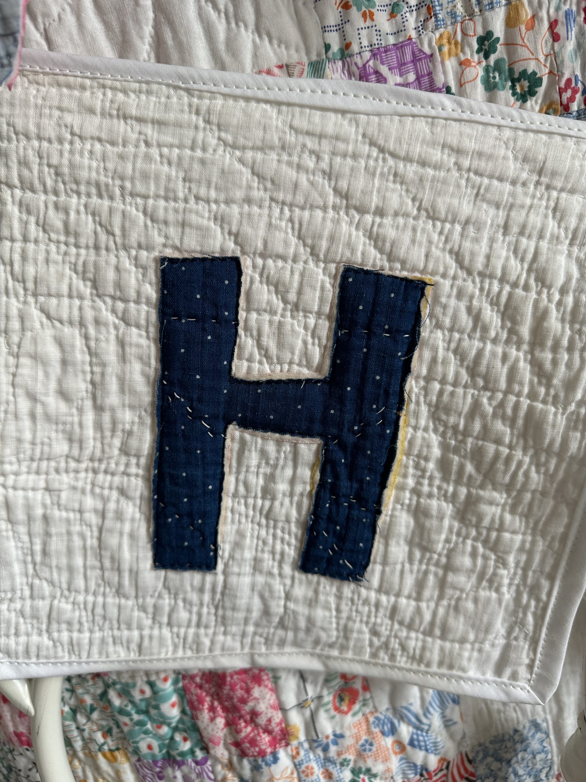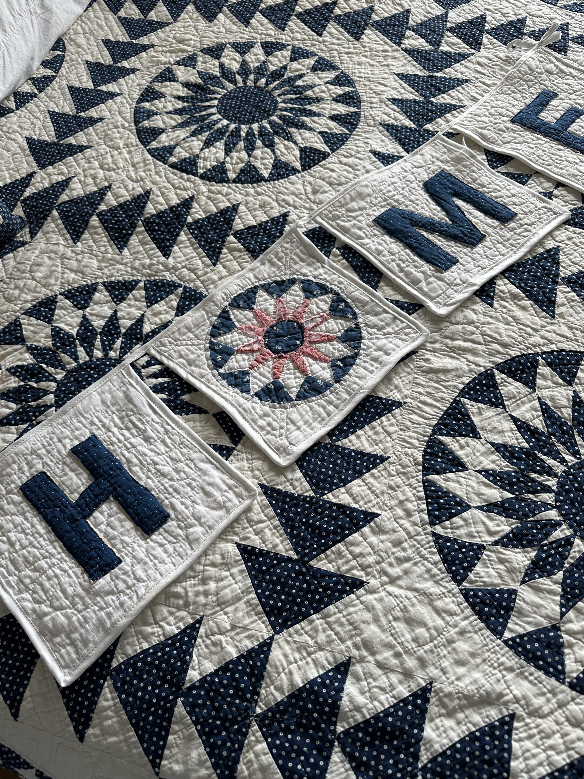 The letters are machine appliqued onto a hand quilted white quilt background made from an early 1880s quilt.