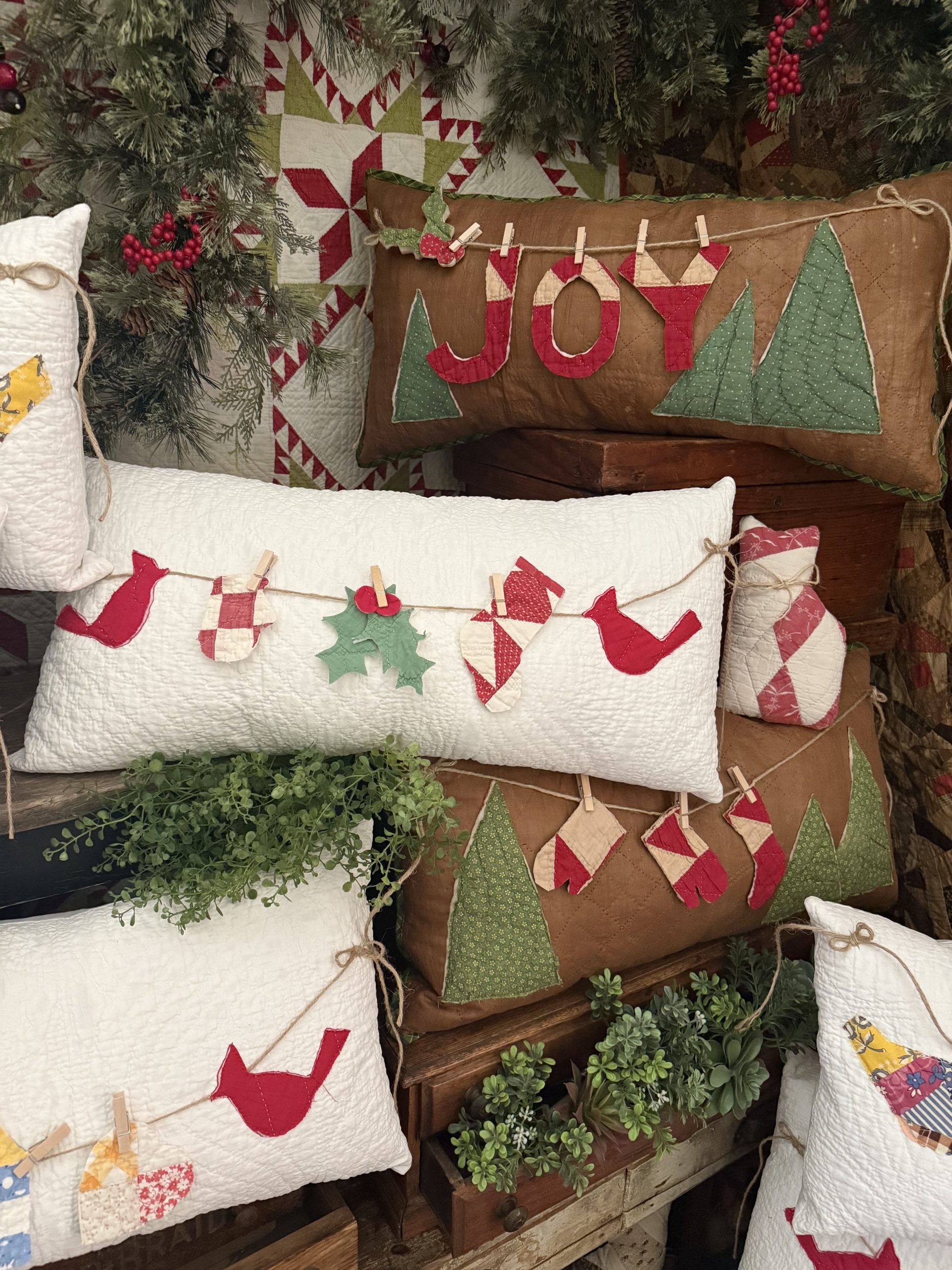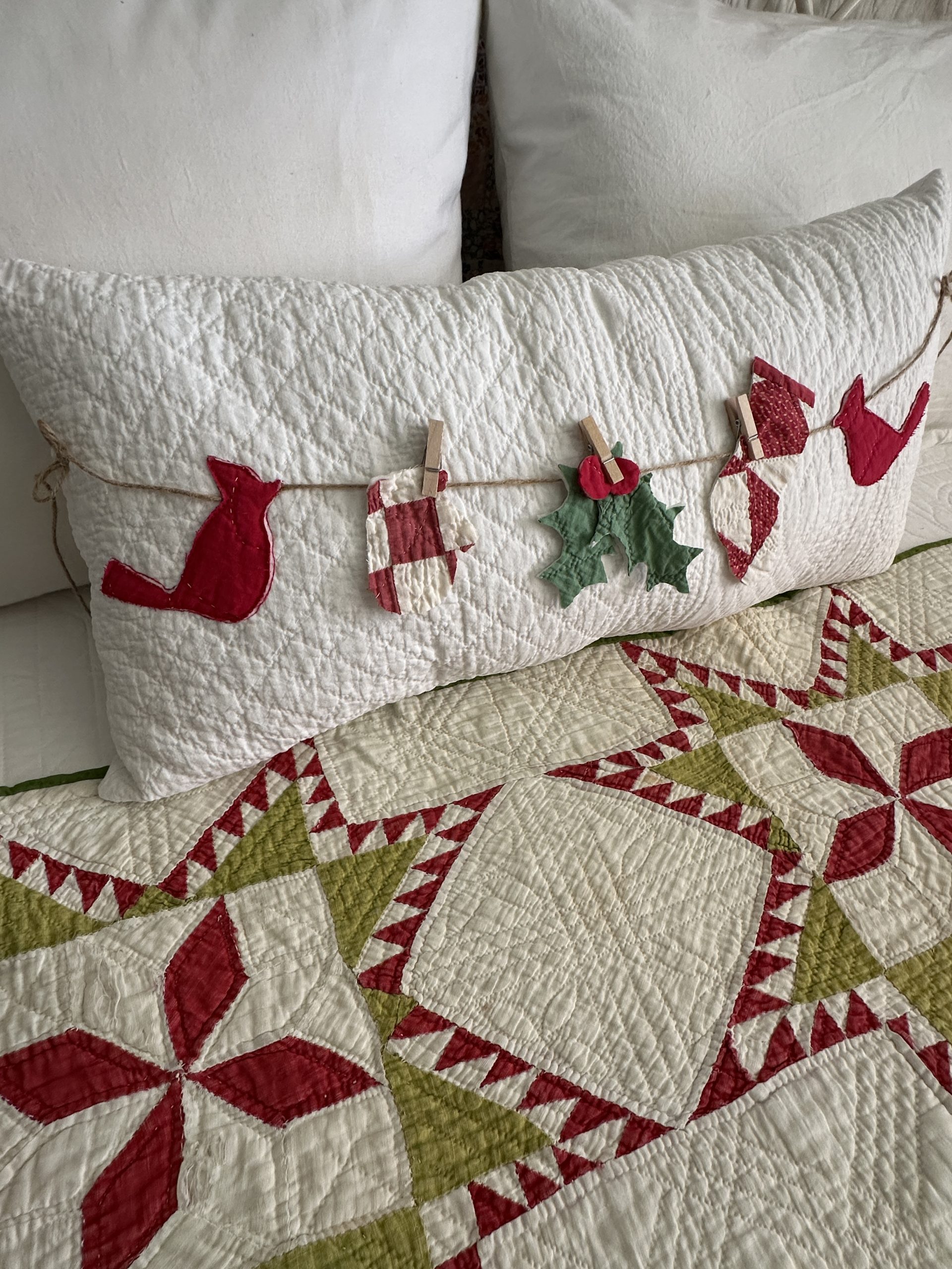 This is our own original design, a sweet vintage quilt pillow that features 2 red cardinals and a twine clothesline to hold our unique quilt charms*©Vintageblessings2025