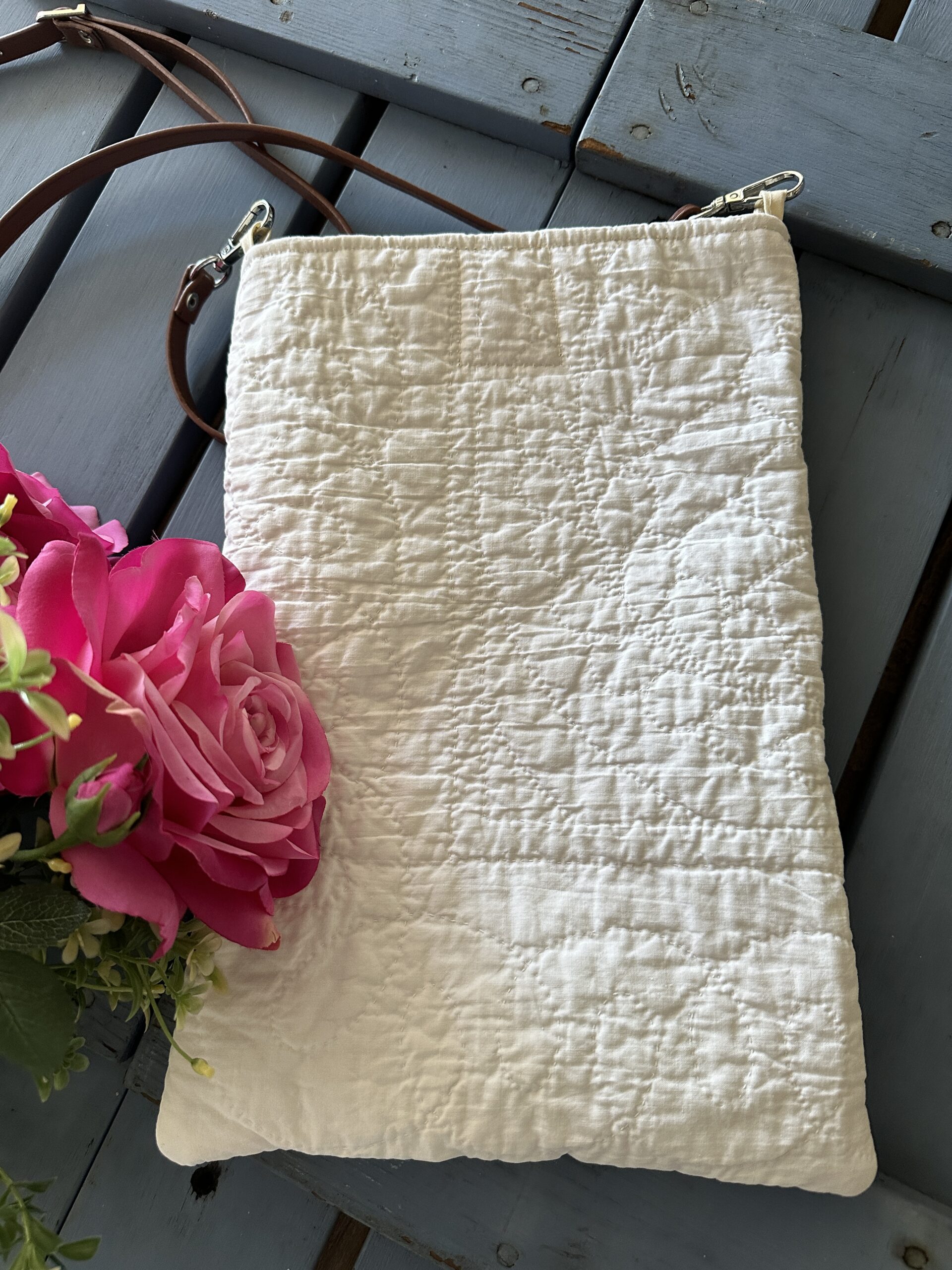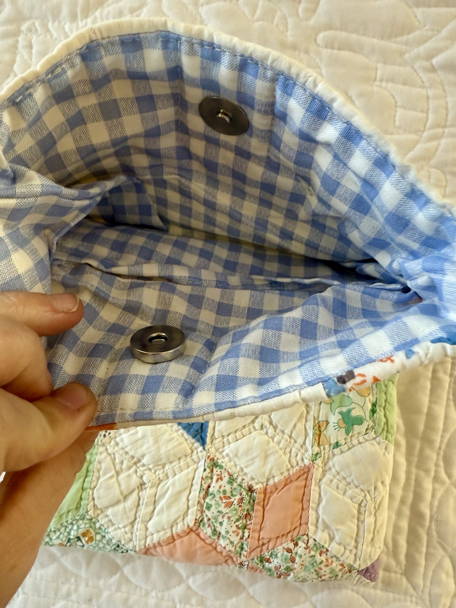 Measures larger size in 8″ wide and 11 1/2″ deep, perfect for your magazine, bottle of wine, book, phone, makeup, keys. It has a magnetic snap to close. Inside is one pocket. Fully lined in a sweet blue gingham. The backing is made from a white vintage quilt