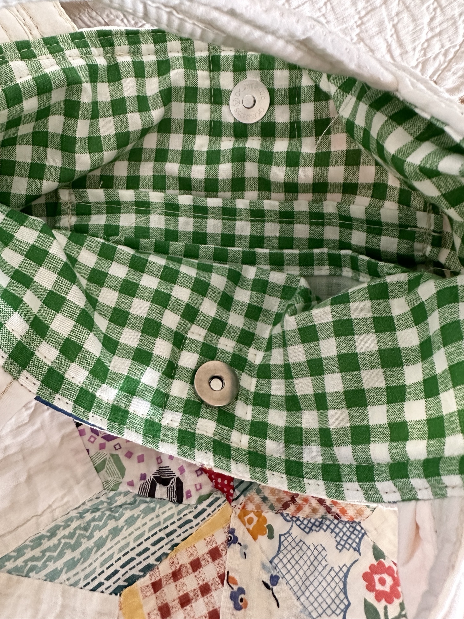 Measures 10 1/2″ wide x 11 1/2″ deep with the quilt pattern on one side, the opposite side has a plain white quilt. Inside is lined in green cotton, and features 2 side pockets and a magnetic snap.