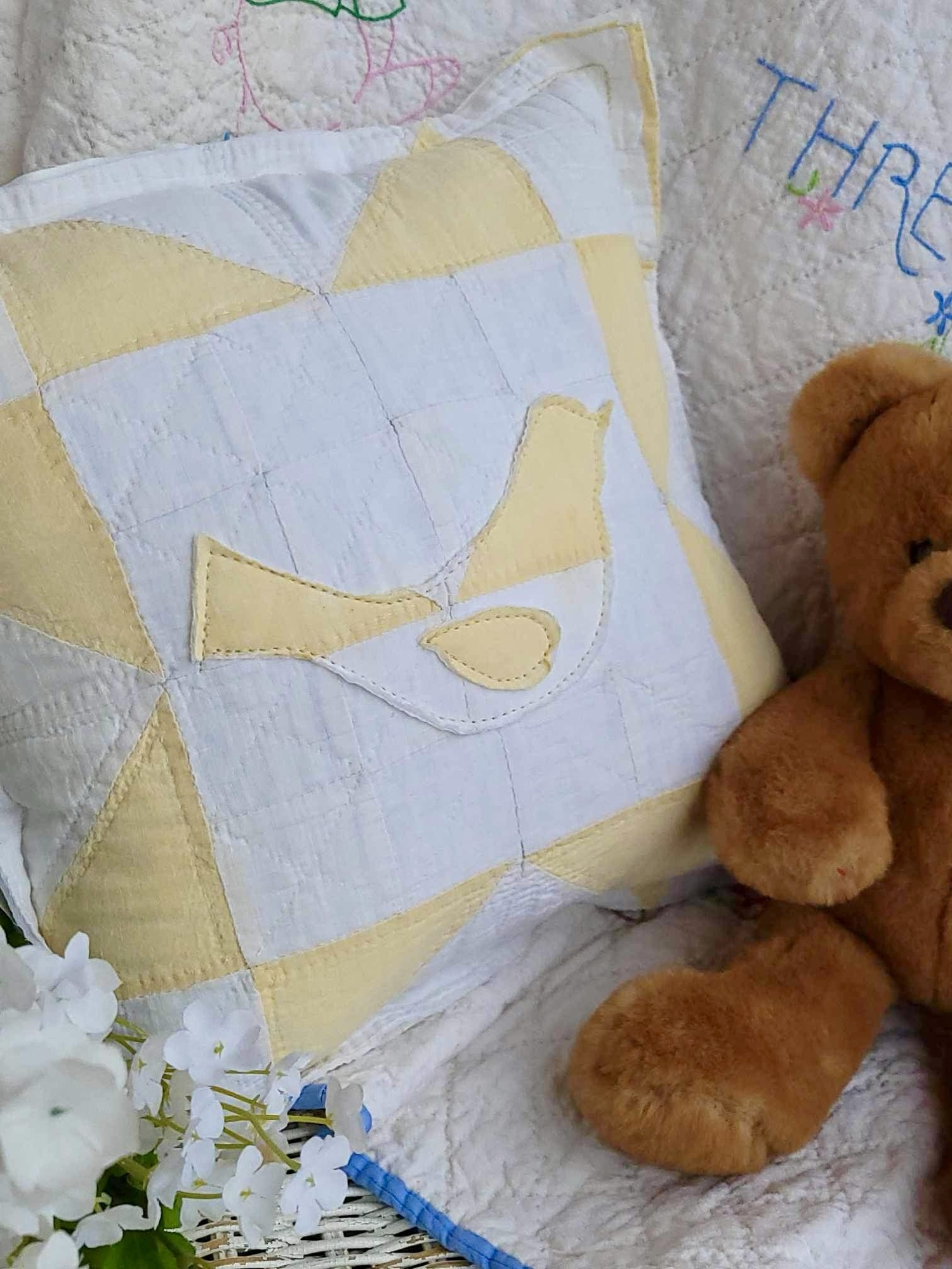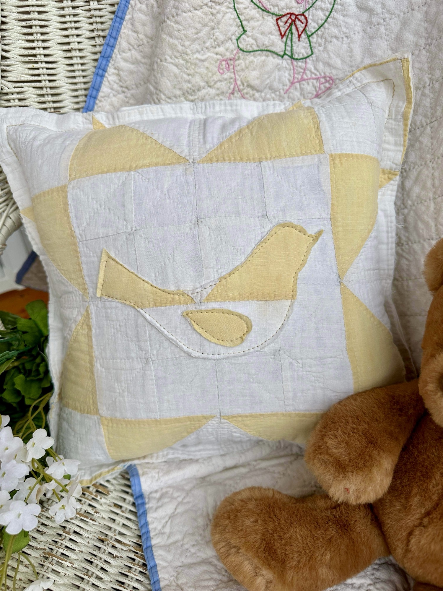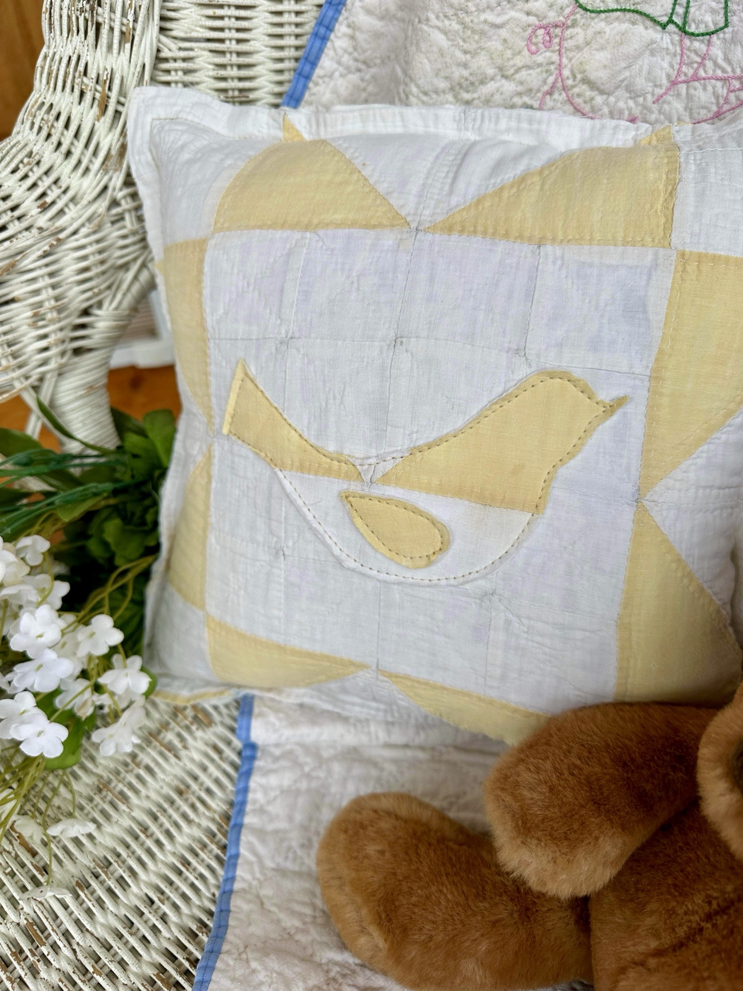 Charming in pale, soft yellow and soft white, this darling pillow features an appliqued bird on a shabby chic vintage c1900 quilt background.