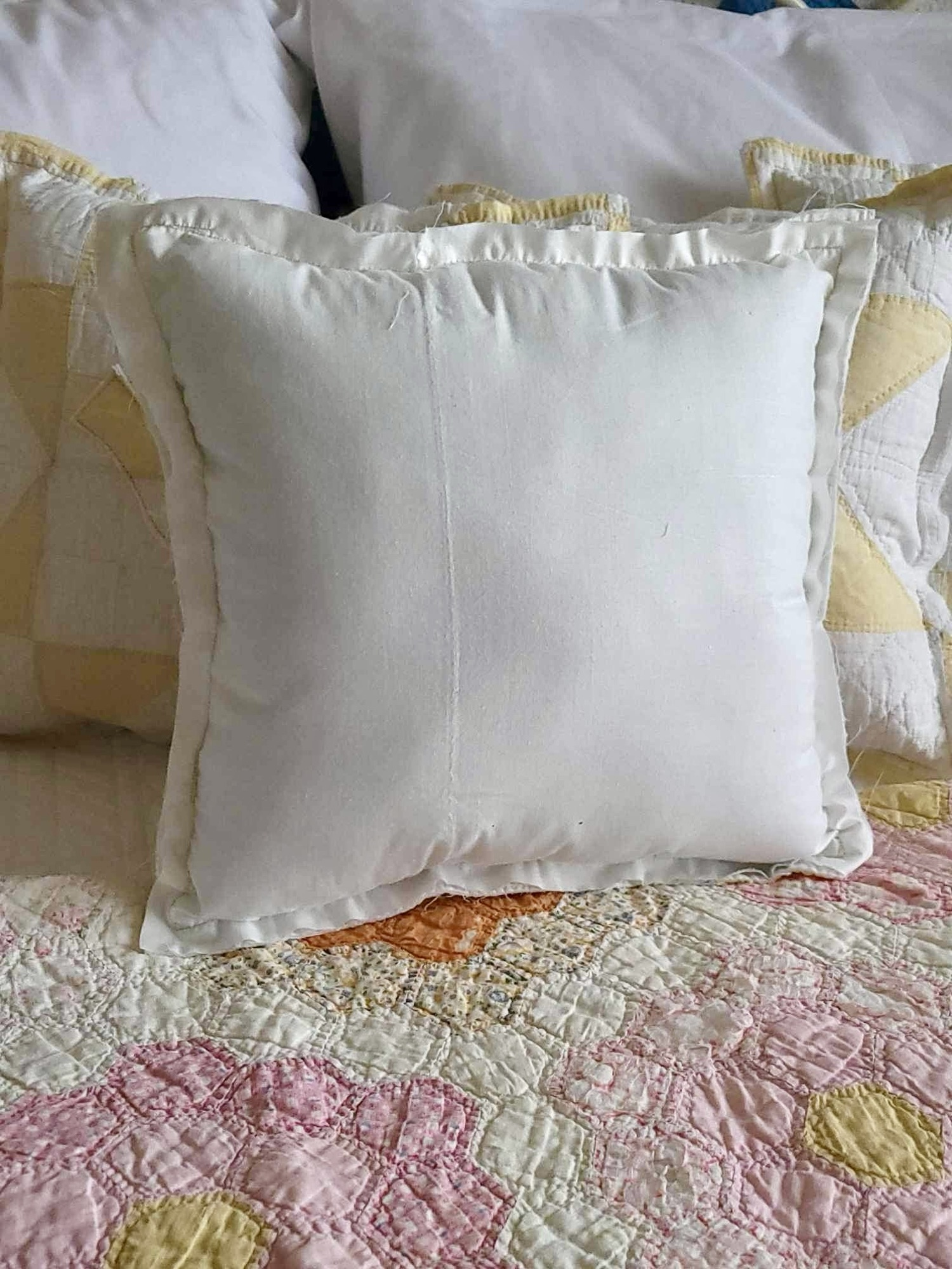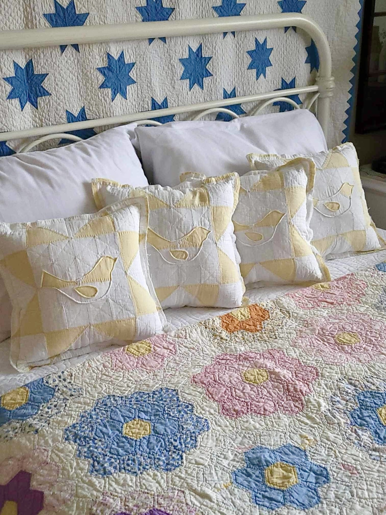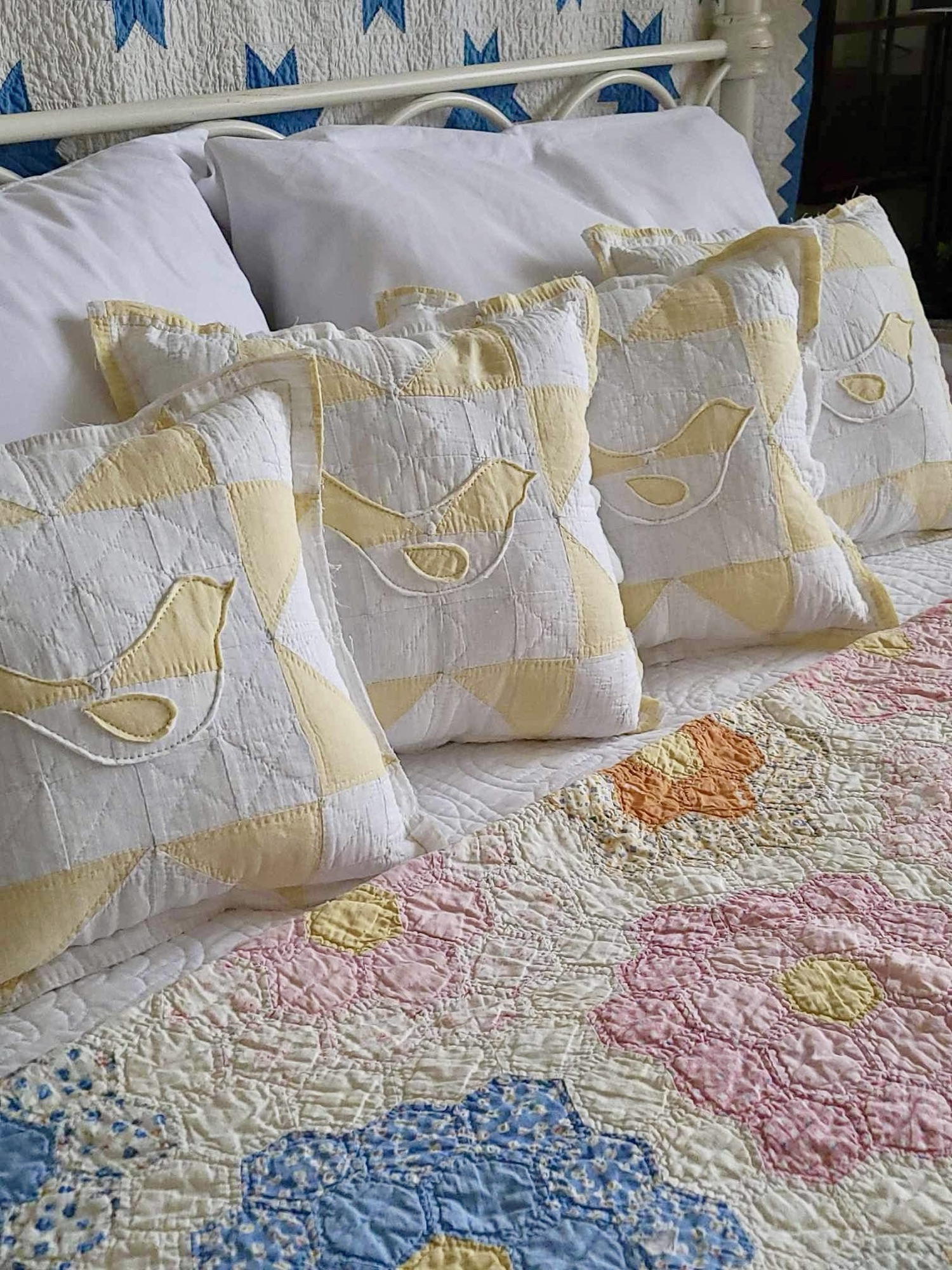 Charming in pale, soft yellow and soft white, this darling pillow features an appliqued bird on a shabby chic vintage c1900 quilt background.