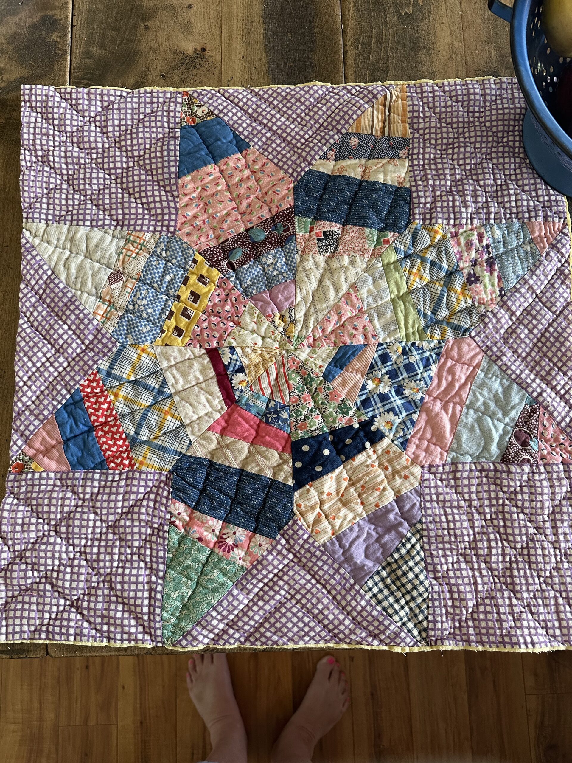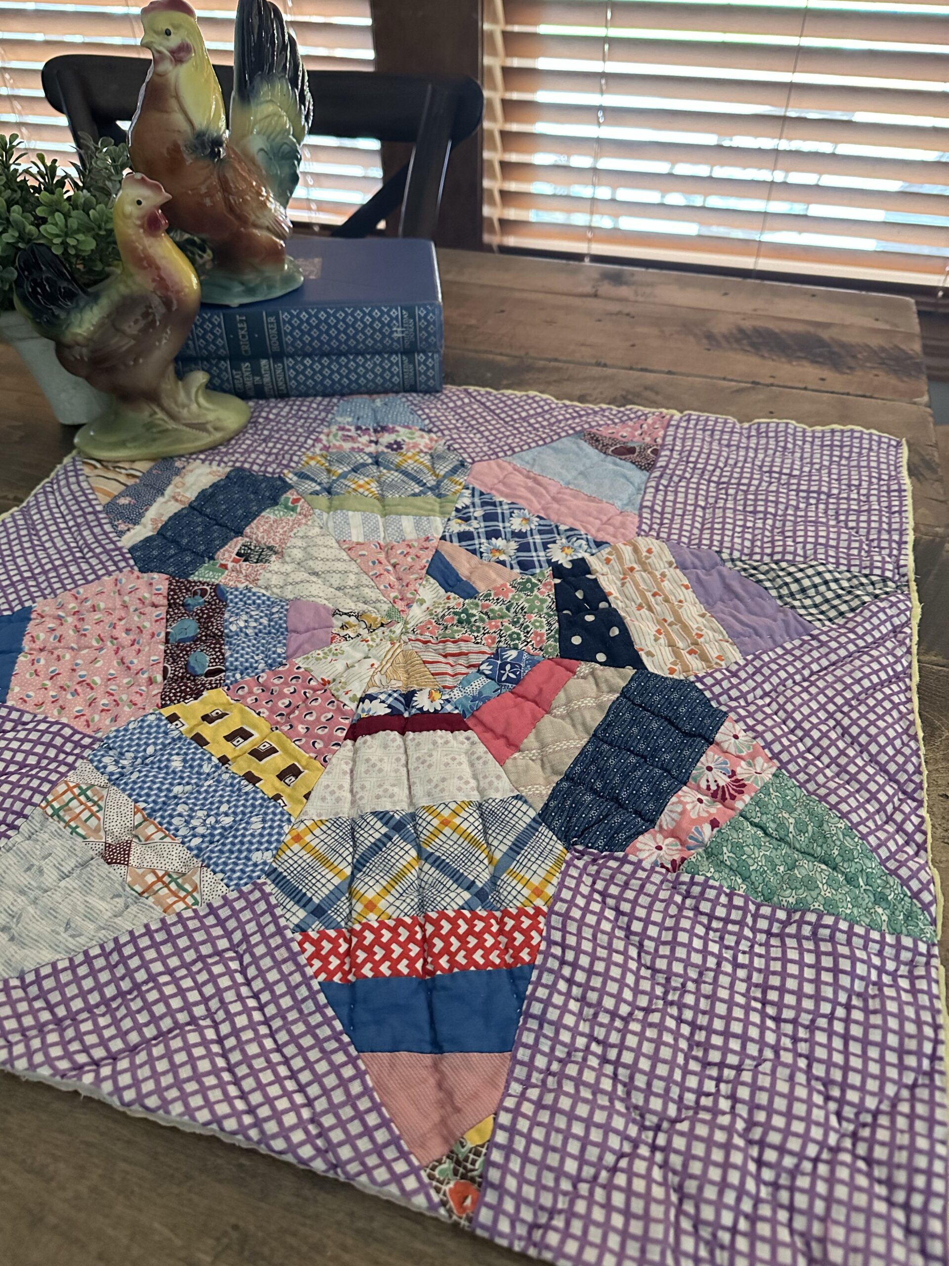 Background is a purple windowpane plaid, star is made of wonderful feedsack prints (these will vary slightly)
