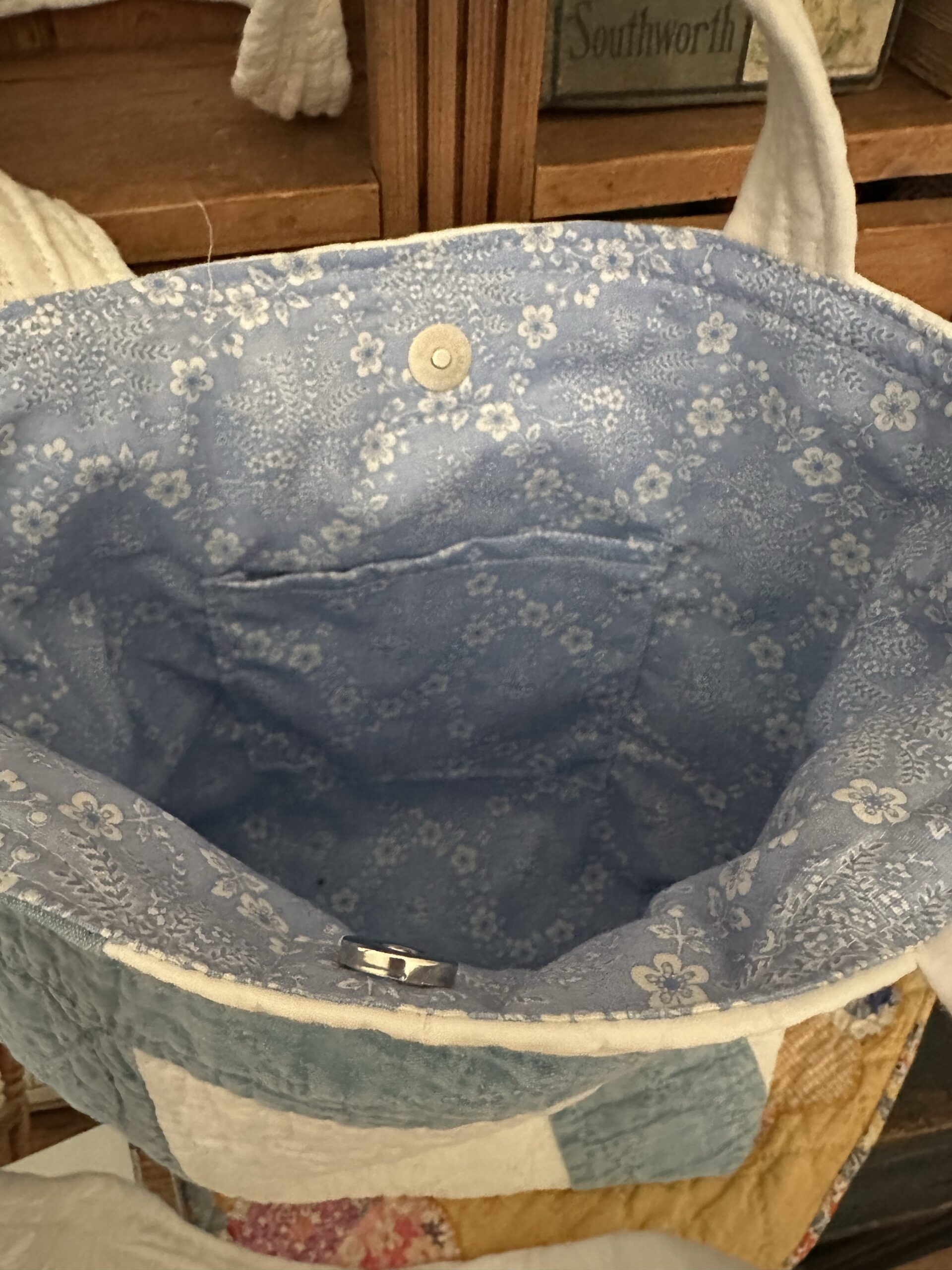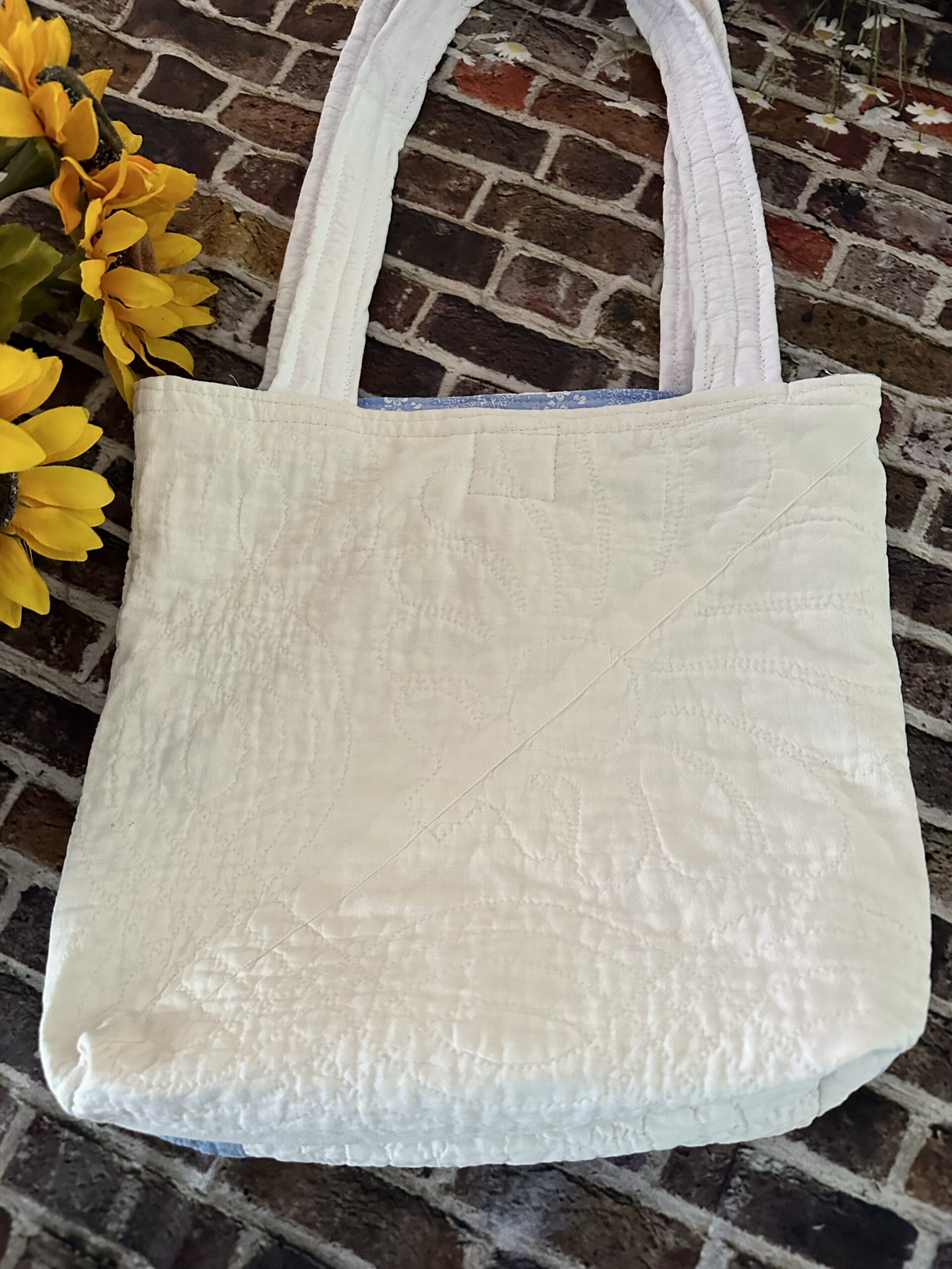 A wonderful vintage quilt tote bag, perfect for laptop, ipad, cell phone, sunscreen. Also large enough to hold a bible or books. Very sturdy.