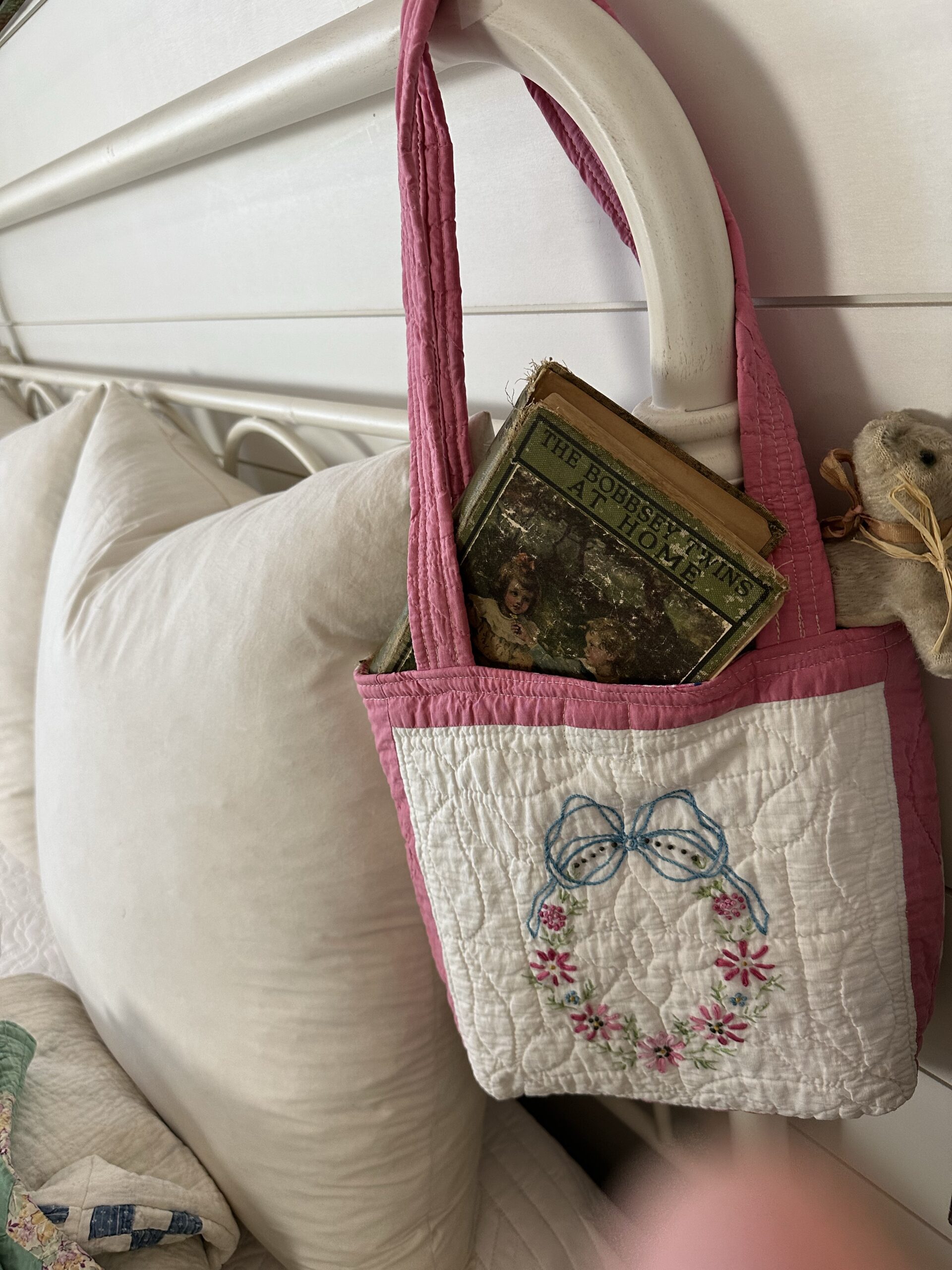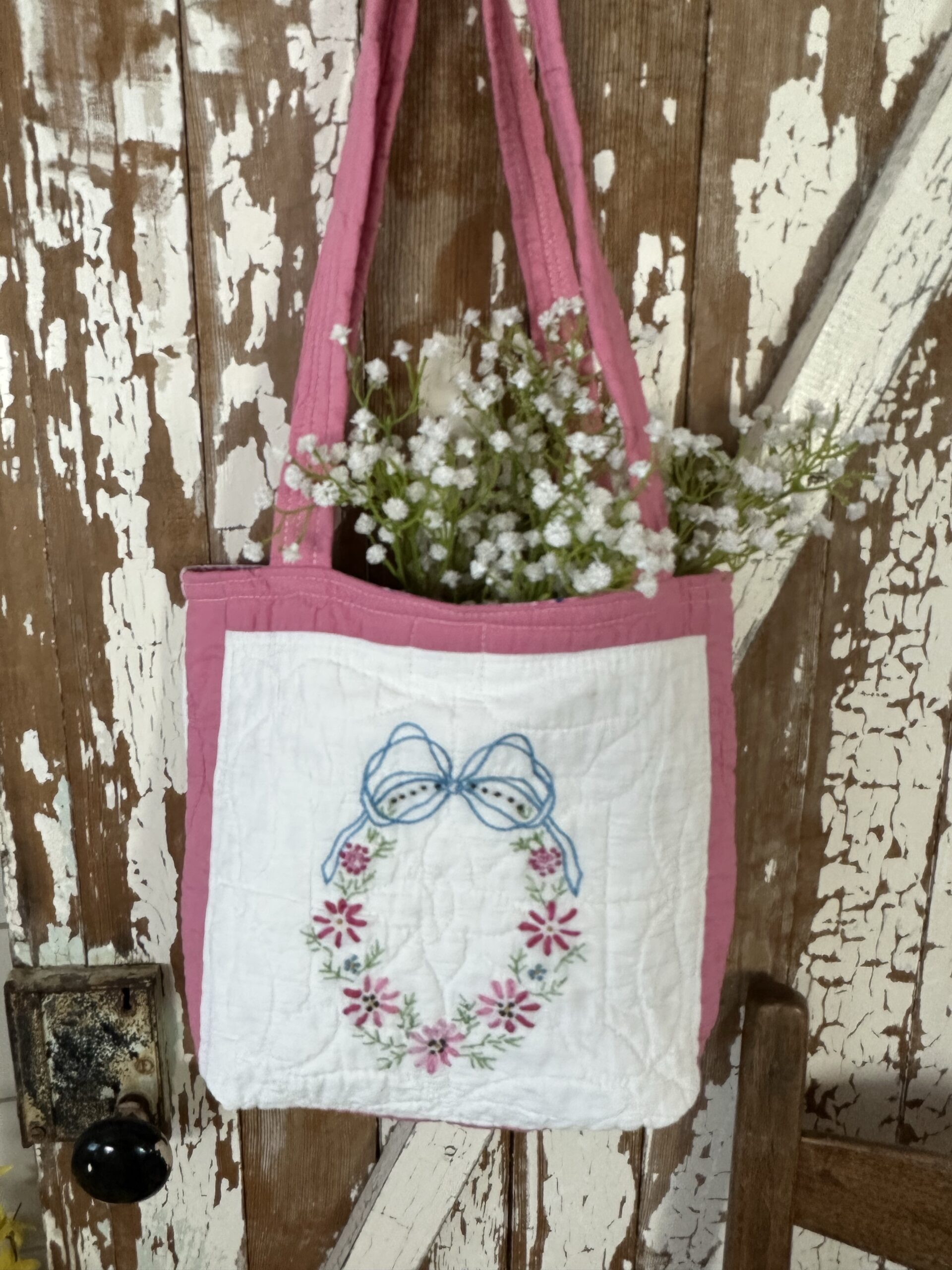Vintage Quilt Market Bag Tote Bookbag Sewing Dainty Wreath