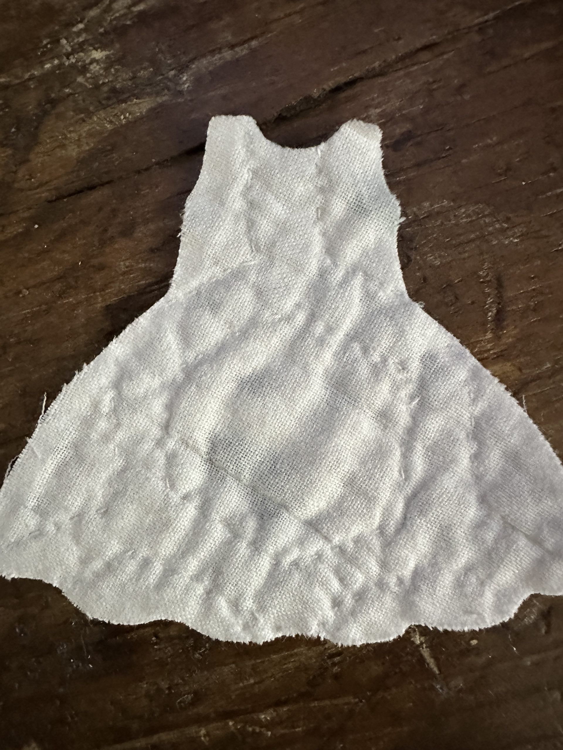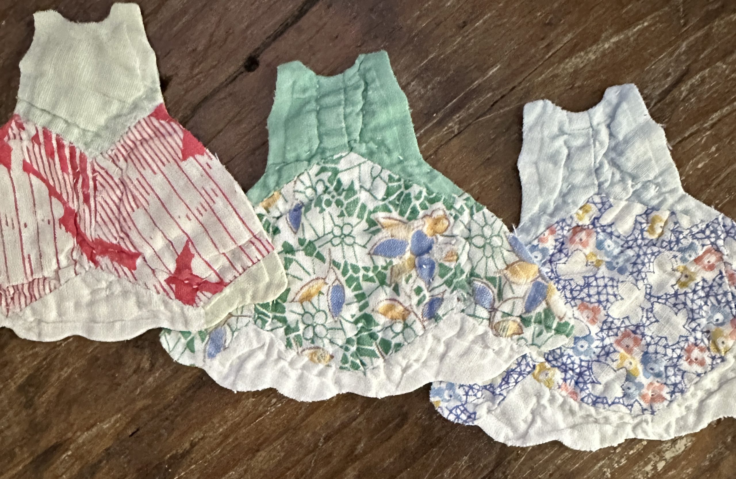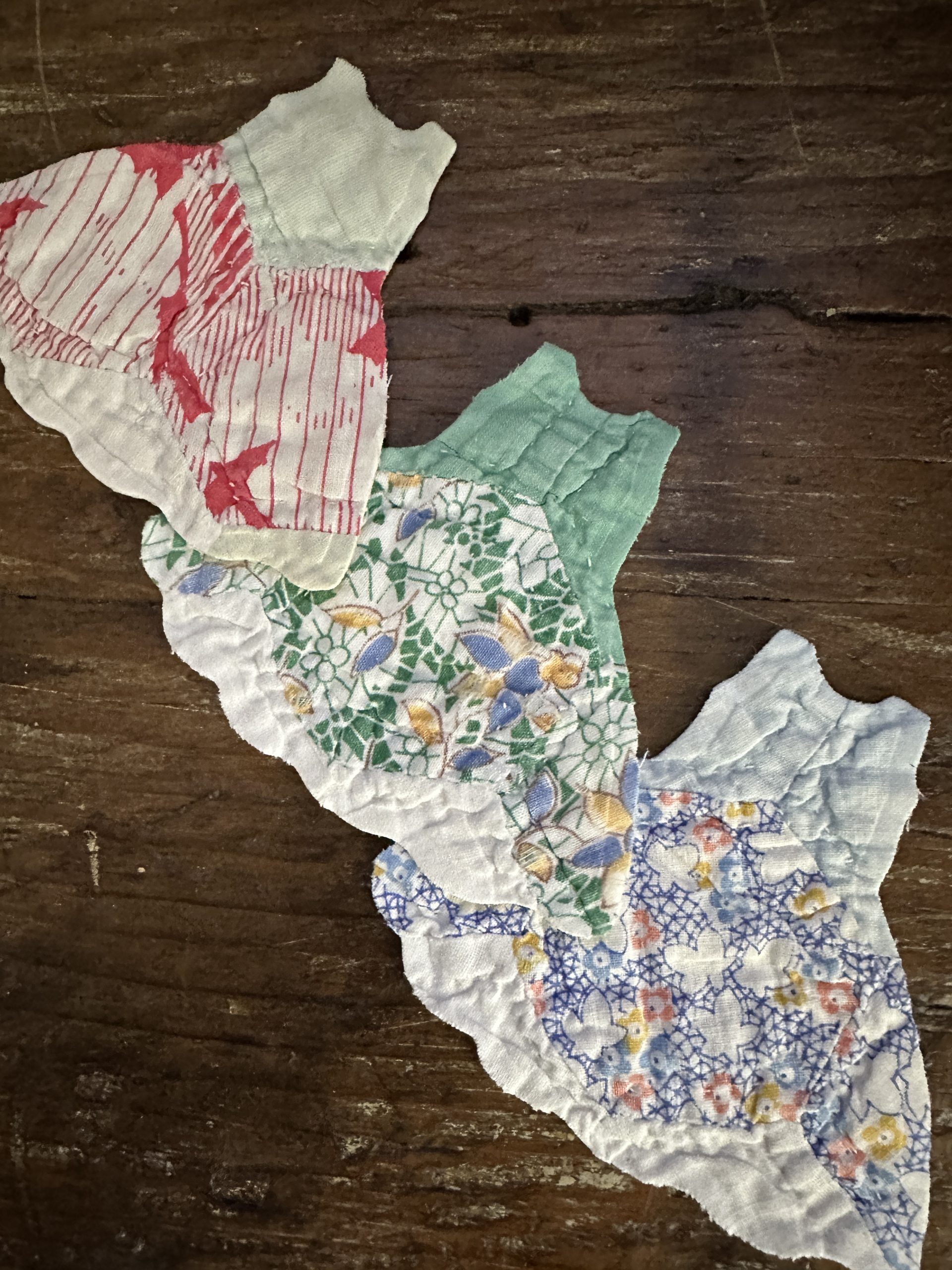 3 Different little girl party dresses made from a 1940s feed sack quilt with tiny pieces. Measures 3″ wide x 2 3/4″ tall (Color/Pattern variety quilt pieces)