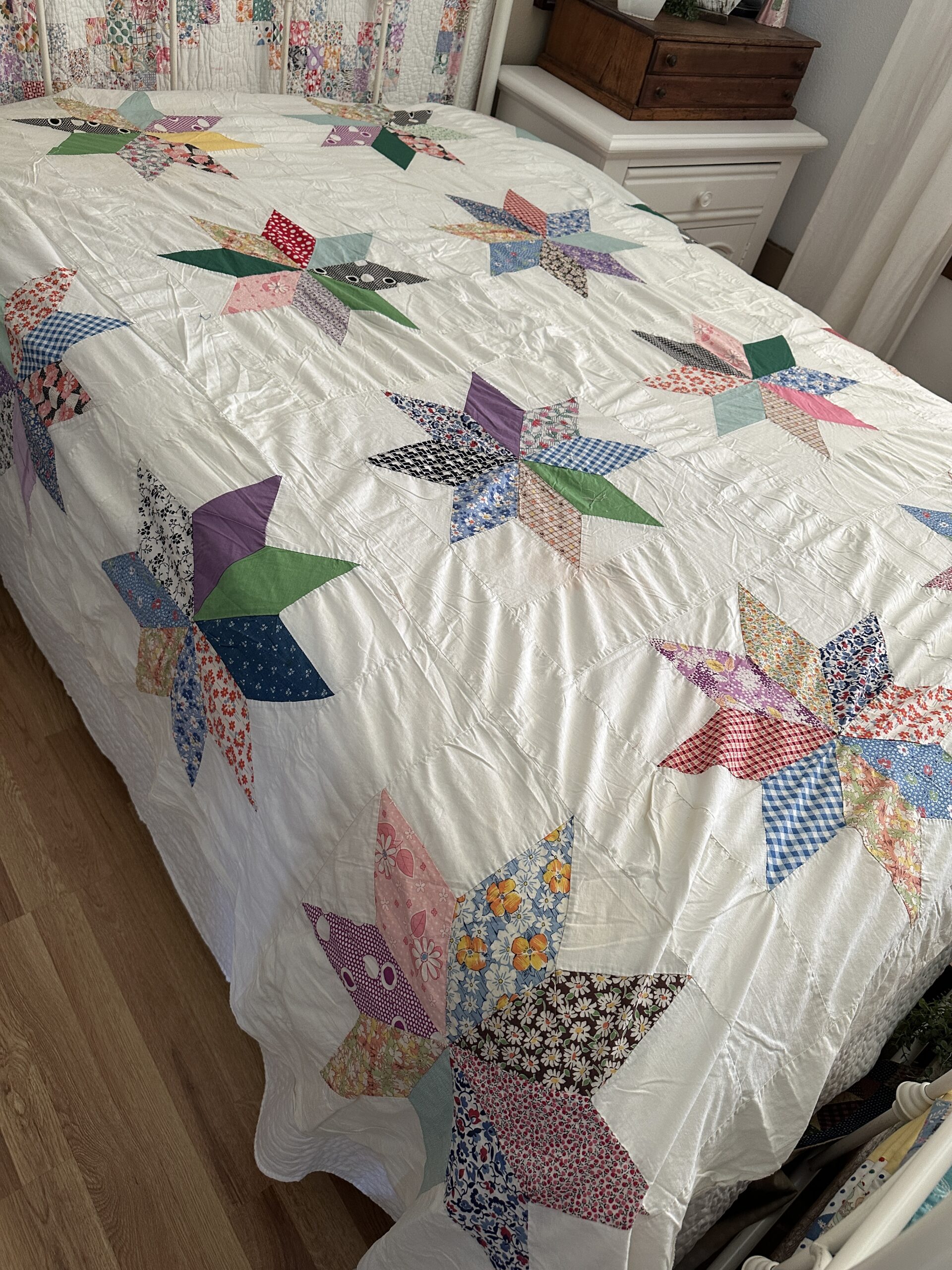 This is a beautiful feed sack quilt top with lovely, large stars.